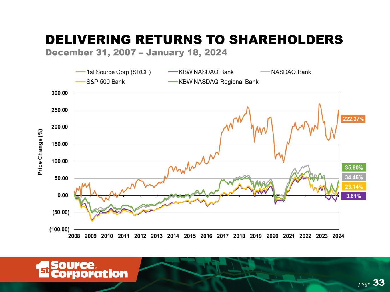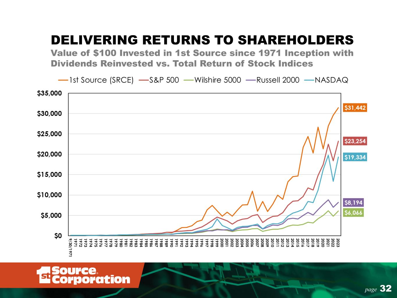 32页交付给股东的回报价值100美元自1971年以来投资于第一源银行,股息再投资vs.股票指数的总回报