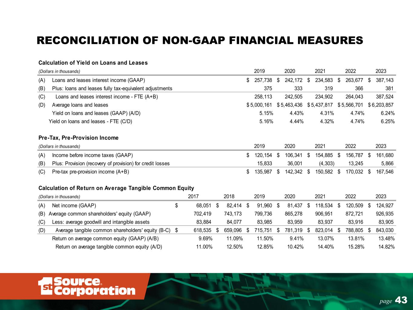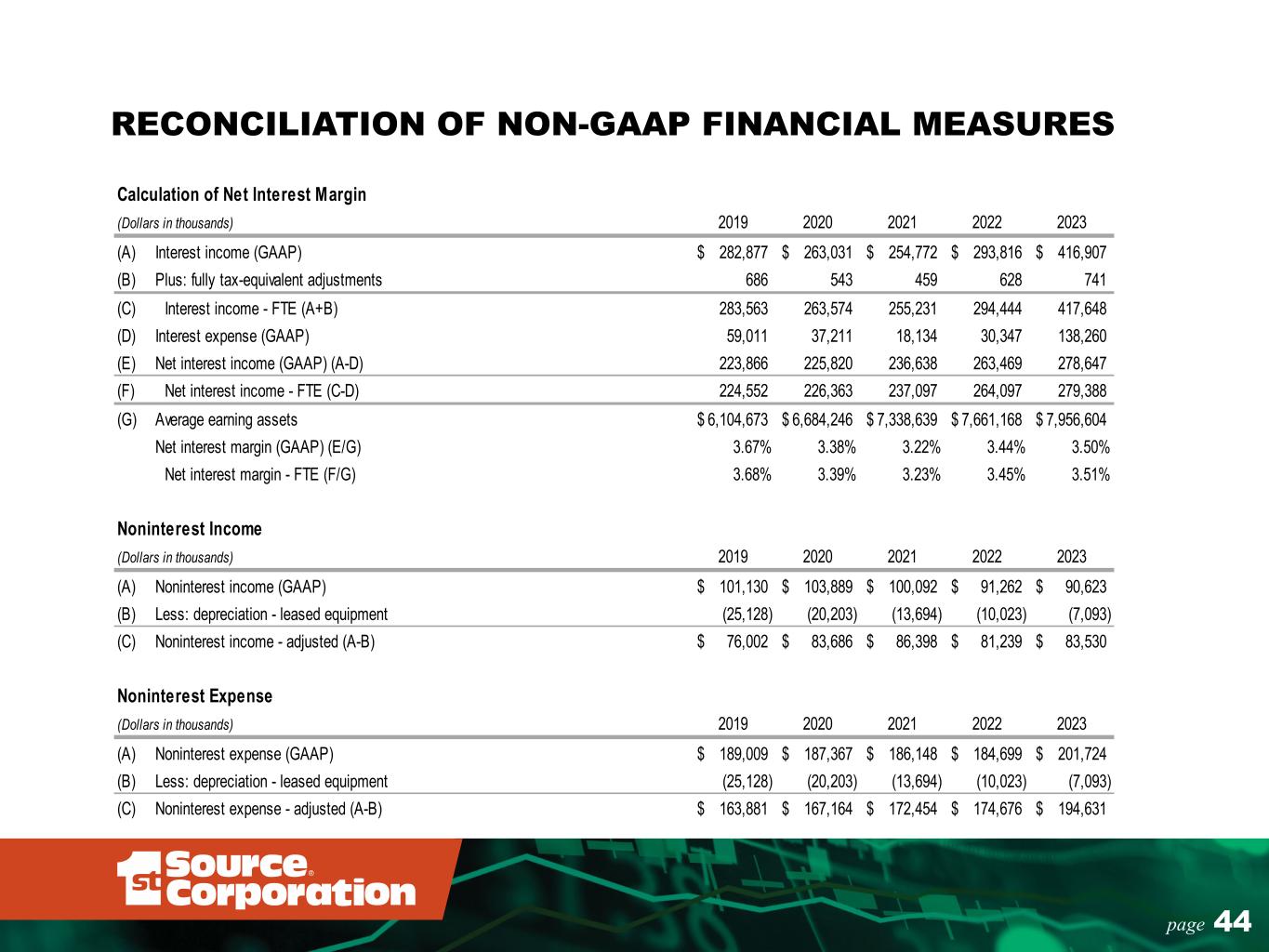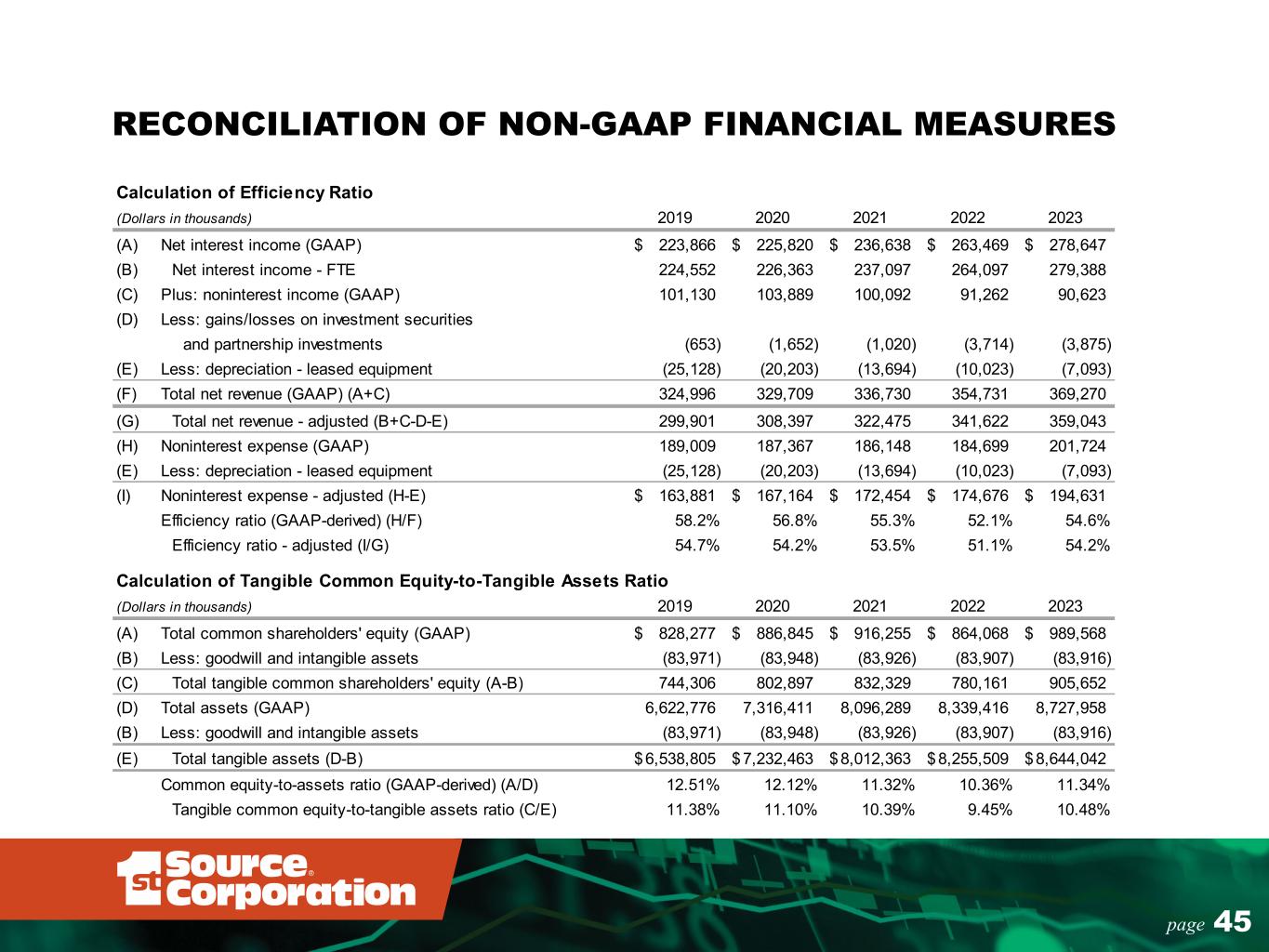 44页非公认会计原则财务措施的调节计算净息差(千美元)20192020202120222023(a)利息收入(GAAP)282,877美元263,031美元254,772美元293,816美元416,907美元(b)加:完全等税调整686543459628741(c)利息收入-FTE(A + B)283,563263,574255,231294,444417,648(d)利息支出(GAAP)59,01137,21118,13430,347138,260(e)净利息收入(GAAP)(A-D)223,866225,820236,638263,469278,647(f)净利息收入-FTE(C-D)224,552226,净息差-FTE(F/G)3.68% 3.39% 3.23% 3.45% 3.51%非利息收入(千美元)20192020202120222023(a)非利息收入(GAAP)101,130 $ 103,889 $ 100,092 $ 91,262 $ 90,623 $(b)减:折旧-租赁设备(25,128)(20,203)(13,694)(10,023)(7,093)(c)非利息收入-调整后(A-B)76,002美元83,686美元86,398美元81,239美元83,530美元非利息费用(千美元)20192020202120222023(a)非利息费用(GAAP)189,009美元187,367美元186,148美元184,699美元201,724美元(b)减:折旧-租赁设备(