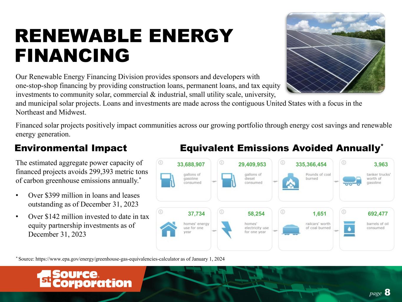8页可再生能源融资我们的Renewable能源融资部门通过向社区太阳能、商业和工业、小型公用事业规模、大学和市政太阳能项目提供建设贷款、永久贷款和税收股权投资,为赞助商和开发商提供一站式融资。贷款和投资遍布美国本土,重点在东北部和中西部。融资太阳能项目通过能源成本节约和可再生能源发电,对我们不断增长的投资组合中的社区产生积极影响。环境影响融资项目的估计总电力容量每年可避免299,393公吨的碳温室气体排放。* •截至2023年12月31日,未偿还的贷款和租赁超过3.99亿美元•截至2023年12月31日,迄今已有超过1.42亿美元投资于税收股权合伙投资*资料来源:https://www.epa.gov/energy/greenhouse-gas-equivalencies-calculator截至2024年1月1日每年避免的等效排放* 33,688,90729,409,953335,366,4543,96337,73458,2541,651692,477