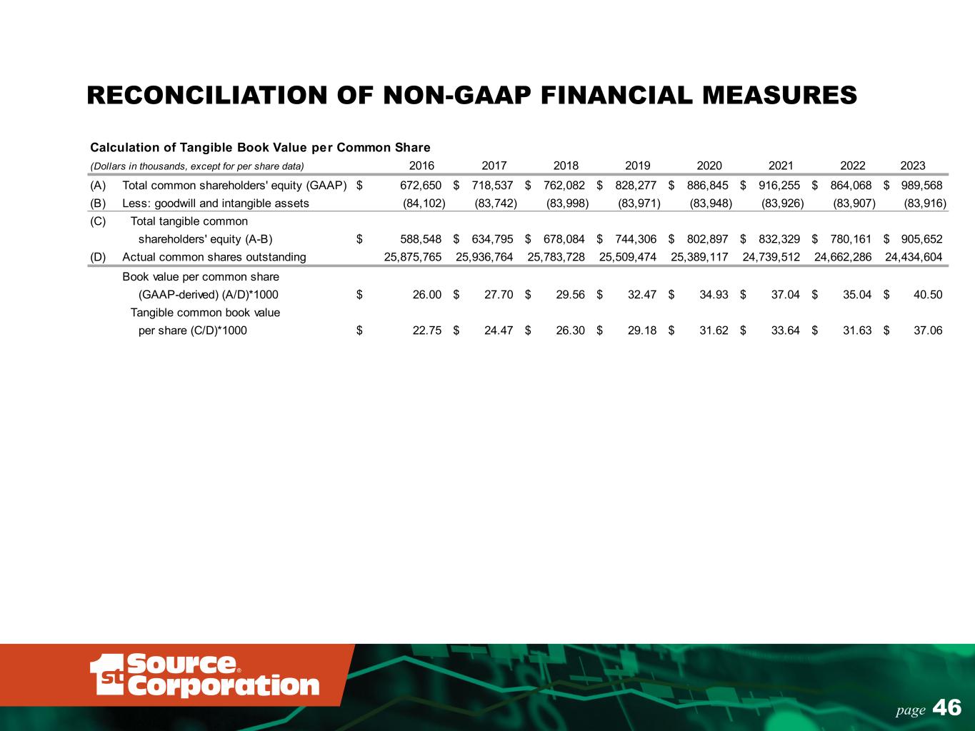 45页非公认会计原则财务措施的调节效率比率的计算(千美元)20192020202120222023(a)净利息收入(GAAP)223,866美元225,820美元236,638美元263,469美元278,647美元(b)净利息收入-FTE 224,552226,363237,097264,097279,388(c)加:非利息收入(GAAP)101,130103,889100,09291,26290,623(d)减:投资证券损益和合伙投资(653)(1,652)(1,020)(3,714)(3,875)(e)减:折旧-租赁设备(25,128)(20,203)(13,694)(10,023)(7,093)(f)总净收入(GAAP)(A + C)324,996329,709336,730354,731369,270(g)总净收入-调整后(B + C-D-E)299,901308,397322,475341,622359,043(H)非利息费用(GAAP)189,009187,367186,148184,699201,724(e)减:折旧-租赁设备(25,128)(20,203)(13,694)(10,023)以千为单位)20192020202120222023(a)普通股股东权益总额(GAAP)828,277美元886,845美元916,255美元864,068美元989,568美元(b)减:商誉和无形资产(83,971)(83,948)(83,926)(83,907)(83,916)(c)有形普通股股东权益总额(A-B)744,306802,897832,329780,161905,652(d)总资产(GAAP)6,622,7767,316,4118,096,2898,339,4168,727,958(b)减:商誉和无形资产(83,971)(83,948)(83,926)(83,907)