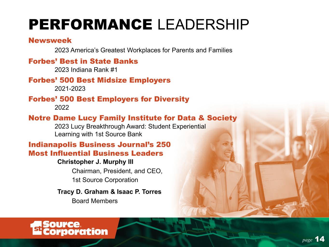 业绩领导力新闻周刊2023美国最适合父母和家庭的工作场所福布斯2023年度州立银行最佳印第安纳州排名# 1福布斯2021-2023年度500位最佳中型雇主福布斯2022年度500位最佳多元化雇主巴黎圣母院Lucy Family Institute for Data & Society 2023 Lucy Breakthrough Award:Student Experiential Learning with 第一源银行 Bank Indianapolis Business Journal的250位最具影响力的商业领袖丨克里斯托弗·J·墨菲三世Christopher J. Murphy III董事长、总裁兼首席执行官,1st Source CorporationTERM2丨特雷西·D·格雷厄姆Tracy D. Graham & Isaac P. Torres董事会成员14 page