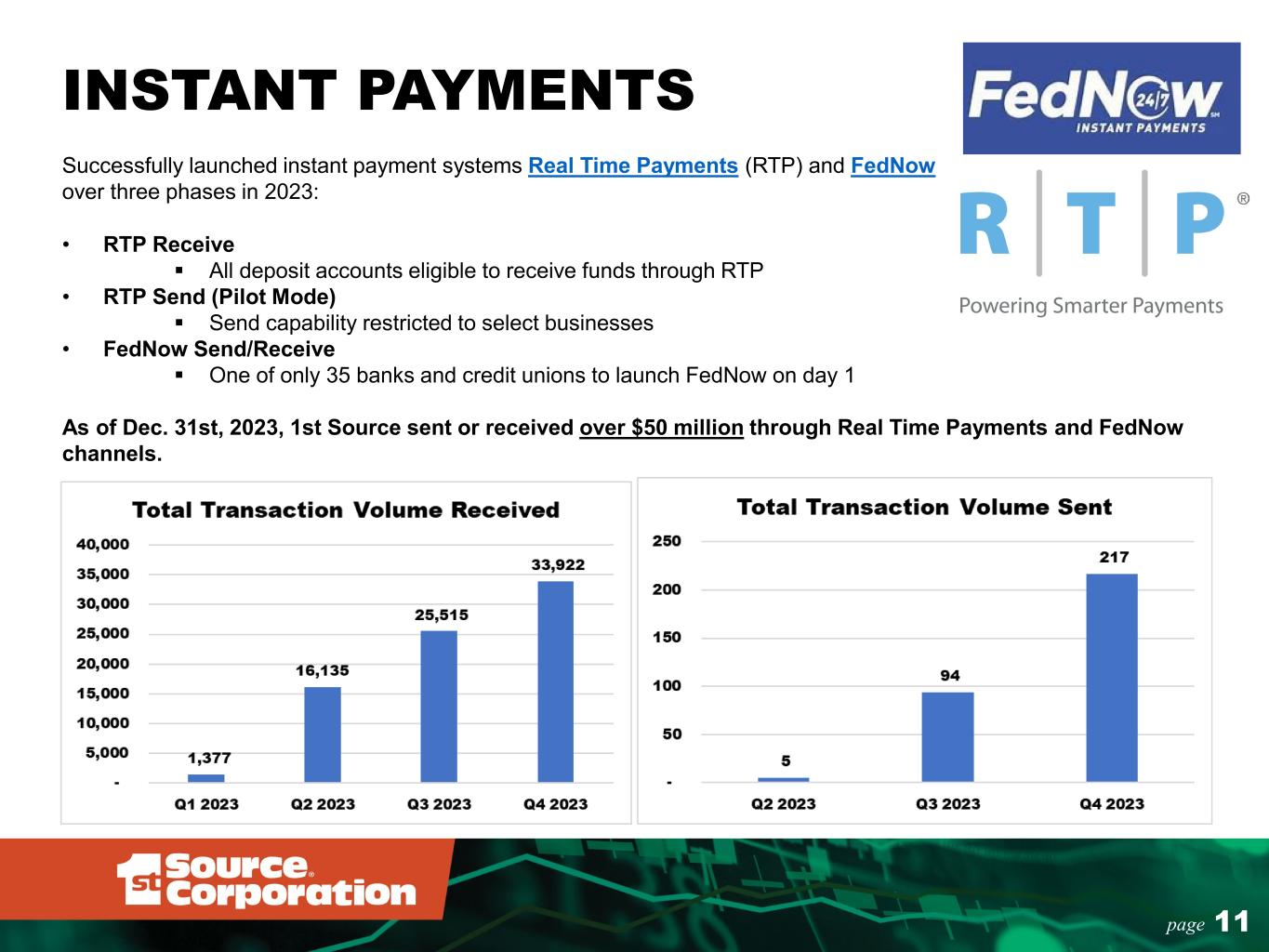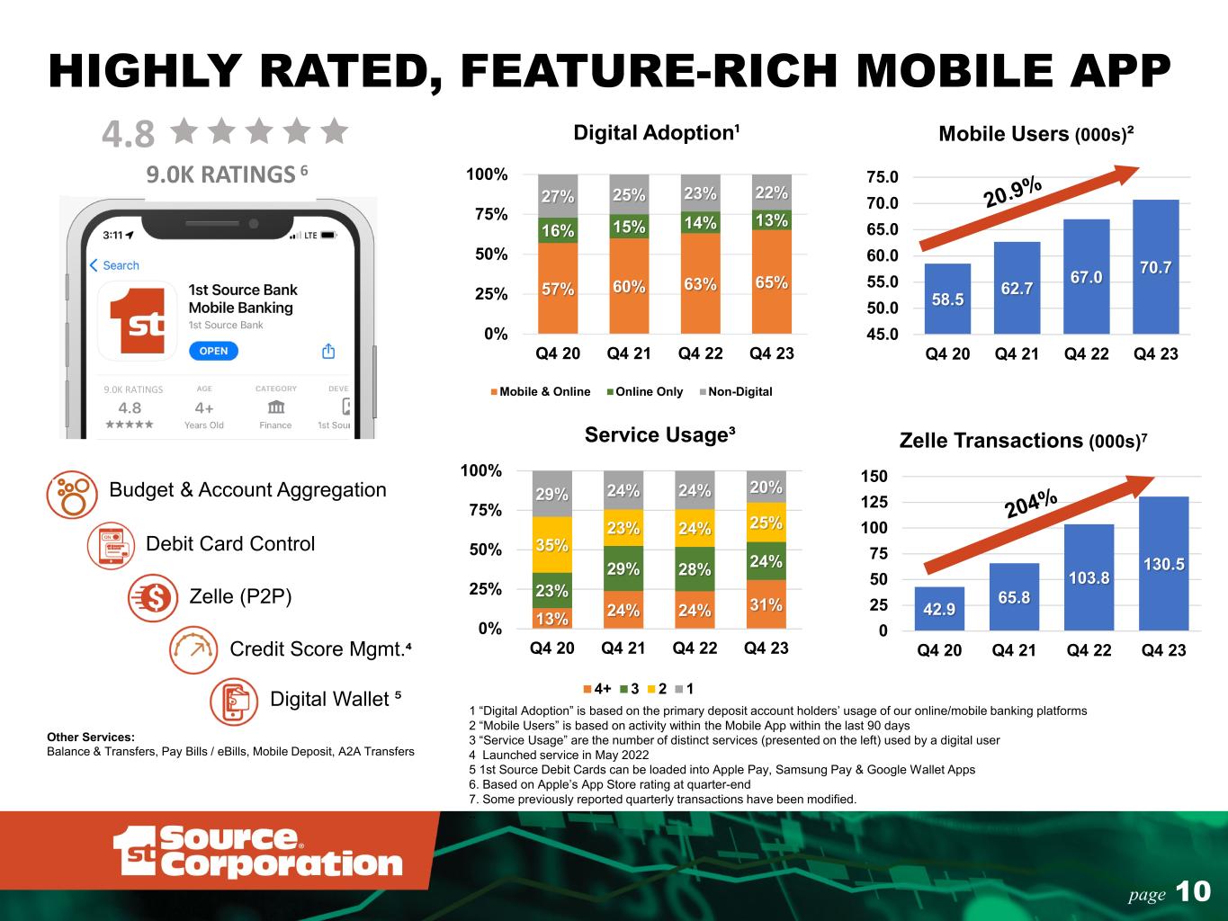 Zelle(P2P)高评级、功能丰富的移动APP预算和账户汇总57% 60% 63% 65% 16% 15% 14% 13% 27% 25% 23% 22% 0% 25% 50% 75% 100% Q4 20 Q4 21 Q4 22 Q4 23数字采纳丨移动和在线仅限非数字13% 24% 24% 31% 23% 29% 28% 24% 35% 23% 24% 25% 29% 24% 24% 24% 20% 0% 25% 50% 75% 100% Q4 20 Q4 21 Q4 22 Q4 23服务使用↓ 4 + 321其他服务:余额和转账、支付账单/电子账单、移动存款,A2A转账58.56 2.76 7.07 0.74 5.05 0.05 5.06 0.06 5.07 0.075.0 Q4 20 Q4 21 Q4 22 Q4 23移动用户(000s)²信用评分管理↓借记卡控制数字钱包42.96 5.8 103.81 30.50255075100125150 Q4 20 Q4 21 Q4 22 Q4 23 Zelle Transactions(000s)71“数字采用”是基于主要存款账户持有人对我们的在线/移动银行平台的使用情况2“移动用户”是基于过去90天内移动App内的活动3“服务使用情况”是可区分服务的数量(在左)由数字用户使用4于2022年5月推出服务5张第一源银行借记卡可装入Apple Pay、Samsung Pay和Google Wallet Apps 6。基于苹果应用商店在7季度末的评级。一些先前报告的季度交易已被修改。..第10页8K评级9.0K评级4.8 9.0K评级6