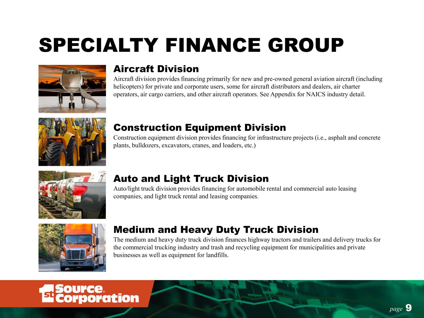 Specialty Finance Group Aircraft Division Aircraft Division主要为私人和企业用户的新的和二手通用航空飞机(包括直升机)提供融资,有些为飞机分销商和经销商、包机运营商、航空货运公司和其他飞机运营商提供融资。NAICS行业详情见附录。建筑设备部门建筑设备部门为基础设施项目(即沥青和混凝土厂、推土机、挖掘机、起重机和装载机等)提供融资。汽车和轻型卡车部门汽车/轻型卡车部门为汽车租赁和商业汽车租赁公司以及轻型卡车租赁和租赁公司提供融资。中型和重型卡车部门中型和重型卡车部门为公路牵引车、拖车和商用卡车运输行业的送货卡车以及市政和私营企业的垃圾和回收设备以及垃圾填埋场的设备提供资金。9页