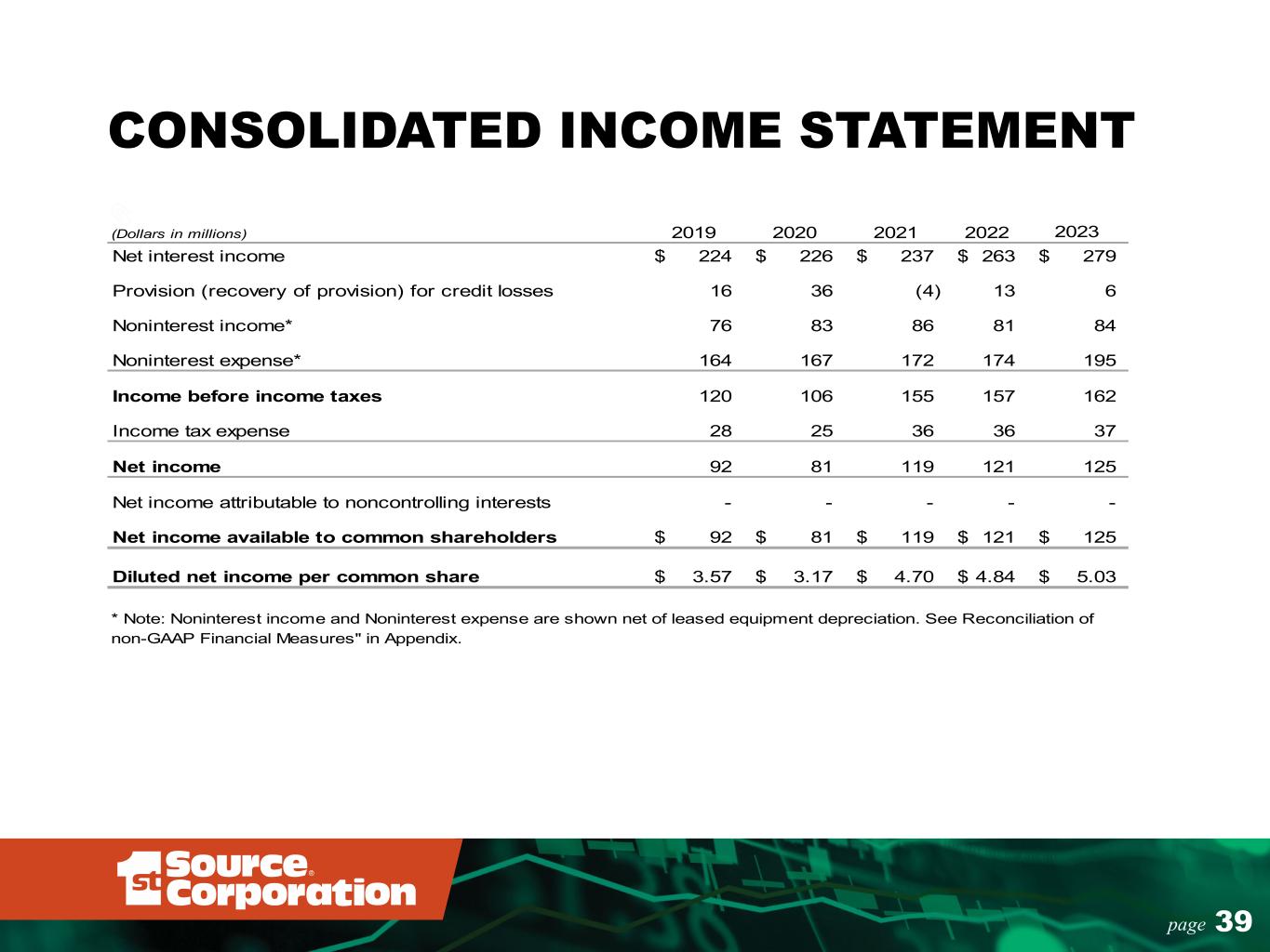 合并资产负债表38页(百万美元)2019年2020年2021年2022年2023年现金和现金等价物83美元243美元525美元123美元130美元投资证券和其他投资* 1,0691,2251,8901,8001,648贷款和租赁,扣除未实现贴现5,1065,5025,3606,0156,520贷款和租赁损失准备金(111)(141)(127)(139)(148)经营租赁项下拥有的设备,净额11265483220其他资产364422400508558总资产6,623 $ 7,316 $ 8,096 $ 8,339 $ 8,728 $无息存款1,217 $ 1,637 $ 2,053 $ 1,998 $ 1,656 $计息存款4,1404,3094,6264,9305,383存款总额5,3575,9466,6796,9287,039借款总额276291330321419其他负债141148118166202股东权益总额829887916864989非控制性权益2044536079总权益849931969241,068 总负债及权益 6,623 $ 7,316 $ 8,096 $ 8,339 $ 8,728 $ *所有投资证券均可供出售。本公司未持有任何持有至到期投资证券。