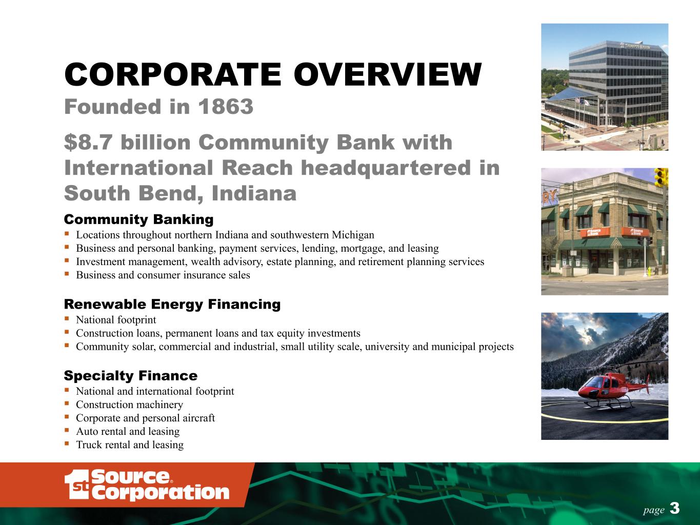 企业概览成立于1863年、价值87亿美元的Community Bank with International Reach总部位于印第安纳州南本德社区银行业务地点遍布印第安纳州北部和密歇根州西南部商业和个人银行业务、支付服务、贷款、抵押和租赁投资管理、财富咨询、遗产规划和退休规划服务业务和消费者保险销售Renewable能源融资国家足迹建设贷款、永久贷款和税收股权投资社区太阳能、商业和工业、小型公用事业规模,大学和市政项目专业金融国家和国际足迹工程机械企业和个人飞机汽车租赁和租赁卡车租赁和租赁3页