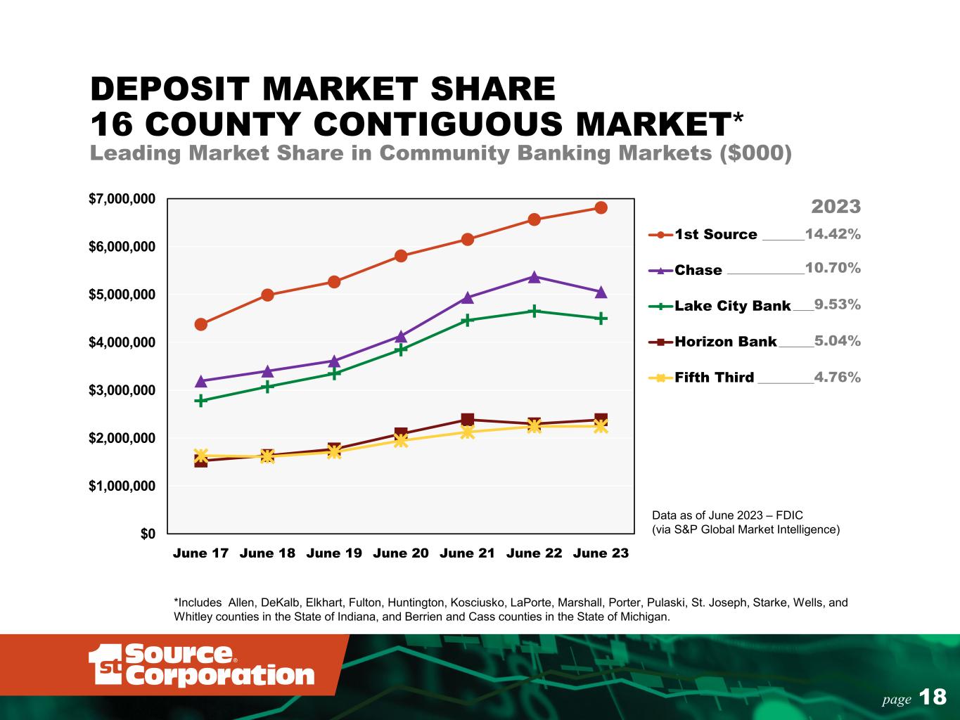18页$ 0 $ 1,000,000 $ 2,000,000 $ 3,000,000 $ 4,000,000 $ 5,000,000 $ 6,000,000 $ 7,000,000 6月17日6月18日6月19日6月20日6月21日6月23日丨第一来源第一源银行 Chase Lake City Bank Horizon Bank 五三银行存款市场份额16县连续市场*社区银行市场领先市场份额(000美元)截至2023年6月的数据– FDIC(通过标普全球市场情报)*包括Allen、DeKalb、Elkhart、Fulton、Huntington、Kosciusko、LaPorte、Marshall、Porter、Pulaski、St. Joseph、Starke、Wells和Whitley县在印第安纳州,以及Berrien和Cass县在密歇根州。2023 ______14.42% ___________10.70% ___9.53% _____5.04% ________4.76%