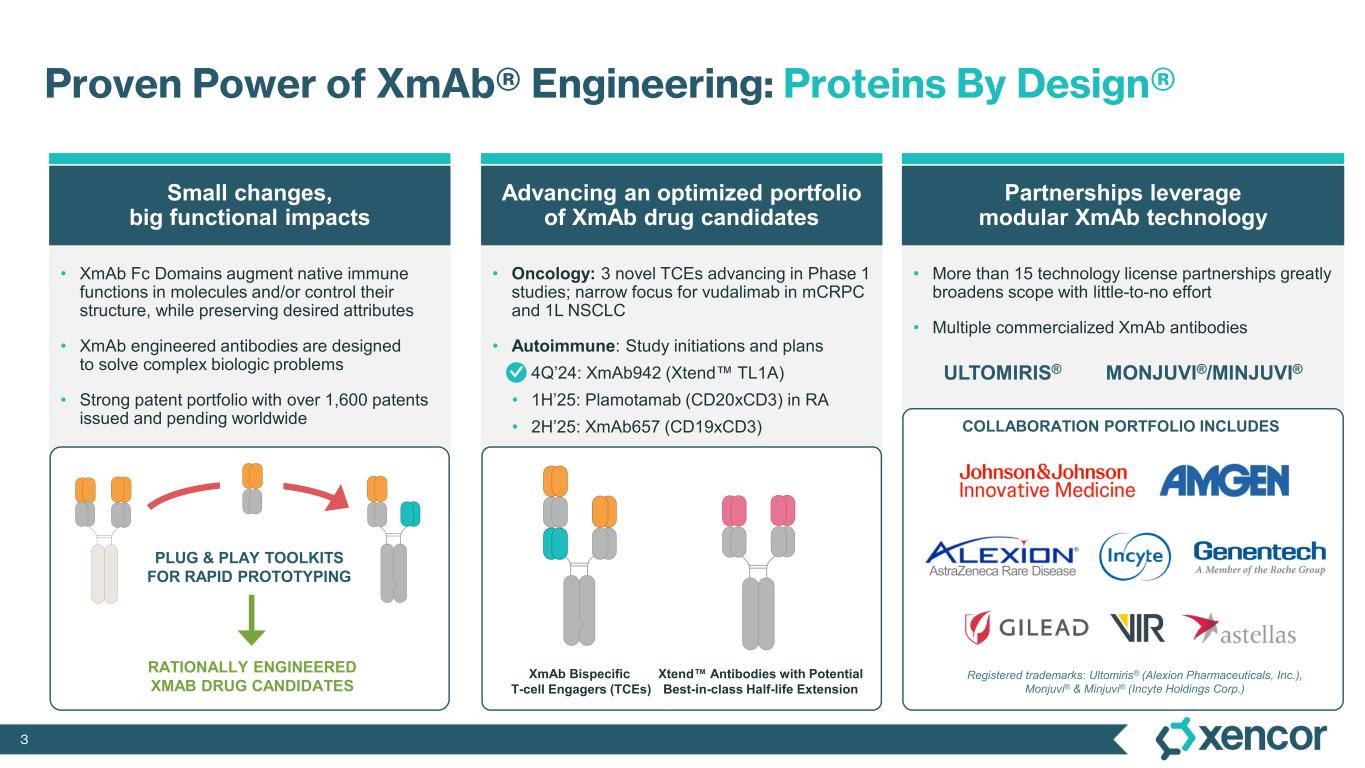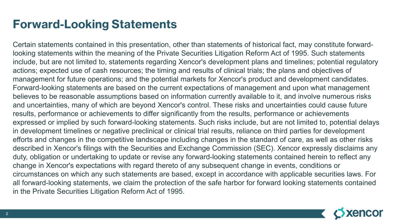 2前瞻性陈述本演示文稿中包含的某些陈述,除历史事实陈述外,可能构成1995年《私人证券诉讼改革法案》含义内的前瞻性陈述。此类声明包括但不限于有关Xencor的开发计划和时间表;潜在的监管行动;现金资源的预期用途;临床试验的时间安排和结果;管理层对未来运营的计划和目标;以及Xencor的产品和开发候选产品的潜在市场的声明。前瞻性陈述基于管理层当前的预期以及管理层根据目前可获得的信息认为合理的假设,涉及众多风险和不确定性,其中许多超出了Xencor的控制范围。这些风险和不确定性可能导致未来的结果、业绩或成就与此类前瞻性陈述明示或暗示的结果、业绩或成就存在显着差异。此类风险包括但不限于开发时间表的潜在延迟或负面的临床前或临床试验结果、开发工作依赖第三方以及竞争格局的变化,包括护理标准的变化,以及Xencor向美国证券交易委员会(SEC)提交的文件中描述的其他风险。Xencor明确表示不承担任何义务、义务或承诺更新或修改此处包含的任何前瞻性陈述,以反映Xencor对任何此类陈述所依据的事件、条件或情况的任何后续变化的预期的任何变化,除非根据适用的证券法。对于所有前瞻性陈述,我们要求保护1995年《私人证券诉讼改革法案》中包含的前瞻性陈述的安全港。