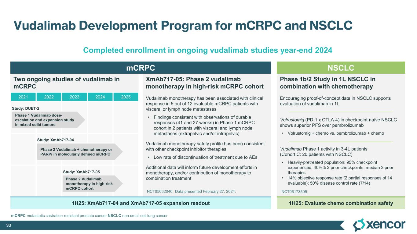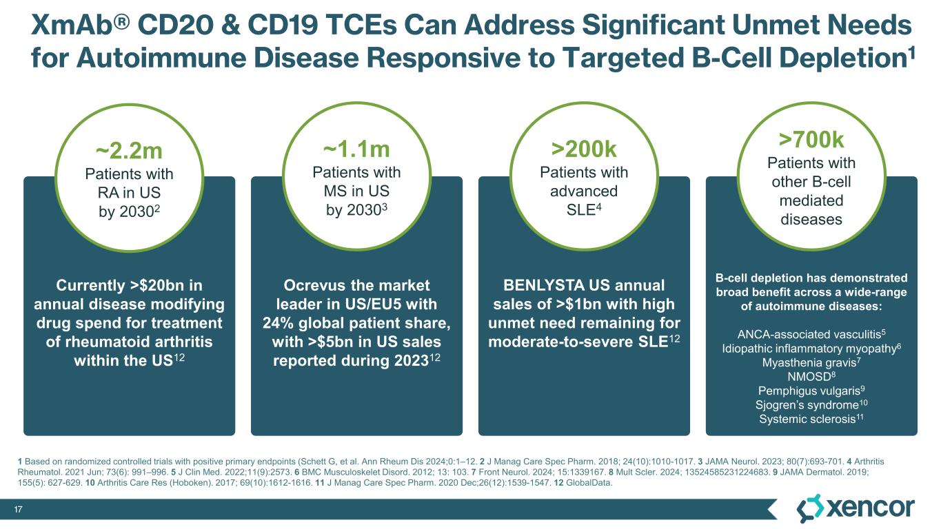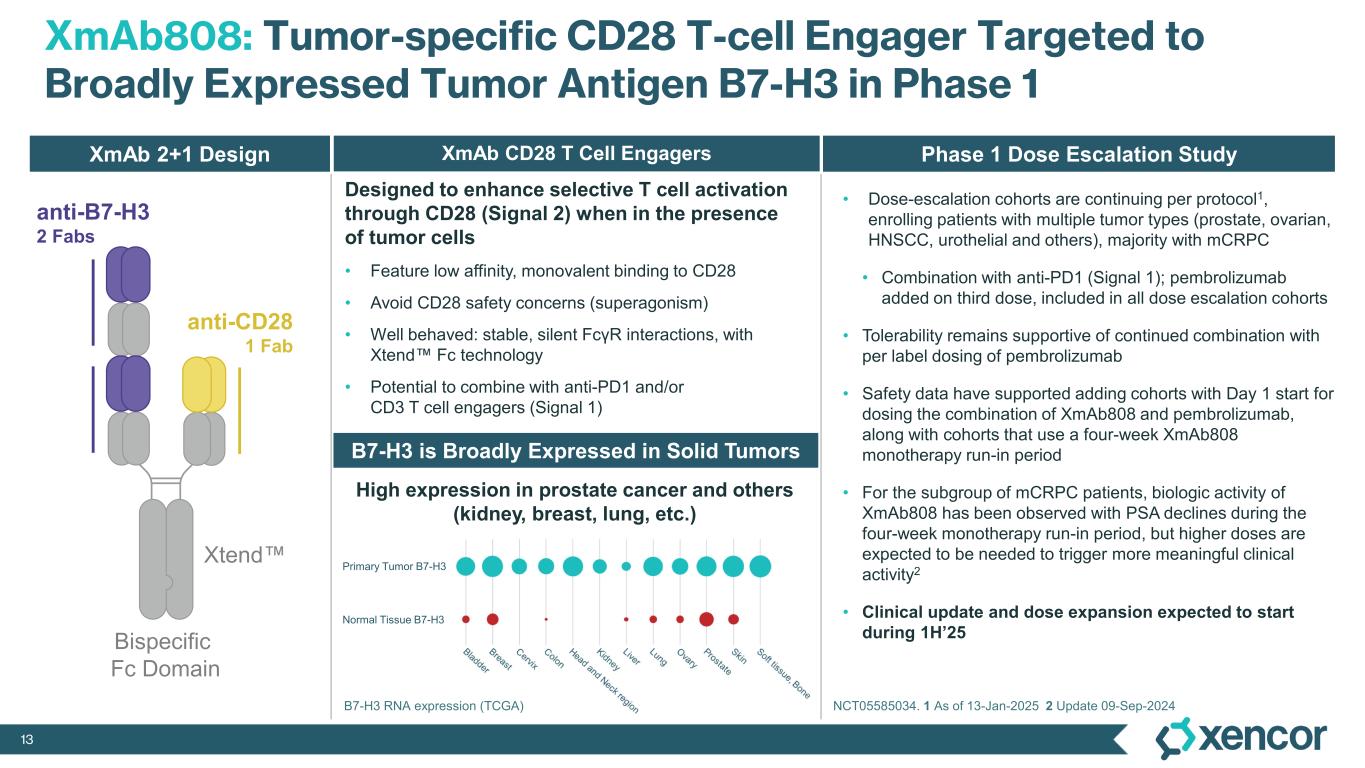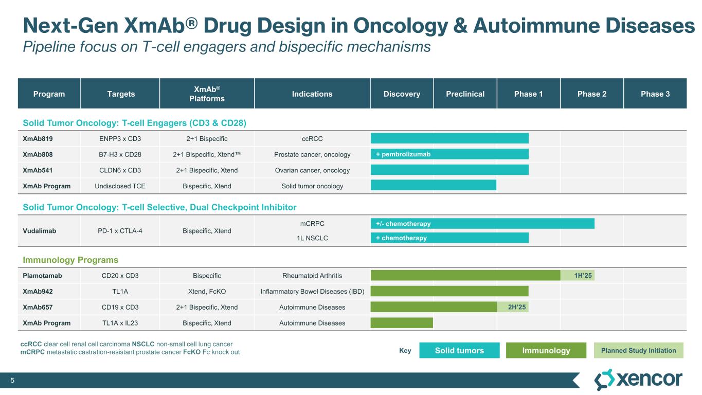 5个项目瞄准XMAB®平台适应症发现临床前1期2期3期实体瘤肿瘤学:T细胞接合剂(CD3 & CD28)XMAB819 ENPP3 x CD3 2 + 1双特异性cCRCC XMAB808 B7-H3 x CD28 2 + 1双特异性、XTend前列腺癌、肿瘤学XMAB541 CLDN6 x CD3 2 + 1双特异性、XTend卵巢癌、肿瘤学XMAb计划未披露TCE双特异性、XTend实体瘤肿瘤学:T细胞选择性、双检查点抑制剂Vudalimab PD-1 x CTLA-4双特异性、XTend mCRPC 1L NSCLC免疫学程序Plamotamab CD20 x CDLXTED自身免疫性疾病XMAB方案TL1A x IL23双特异性、XTED自身免疫性疾病+化疗实体瘤免疫学+ pembrolizumab +/-化疗关键cCRCC透明细胞肾细胞癌NSCLC非小细胞肺癌mCRPC转移性去势抵抗性前列腺癌FCKO FC敲除1H‘25 2H’25计划研究启动下一代XMAB®肿瘤学药物设计&自身免疫性疾病管线聚焦T细胞接合剂和双特异性机制