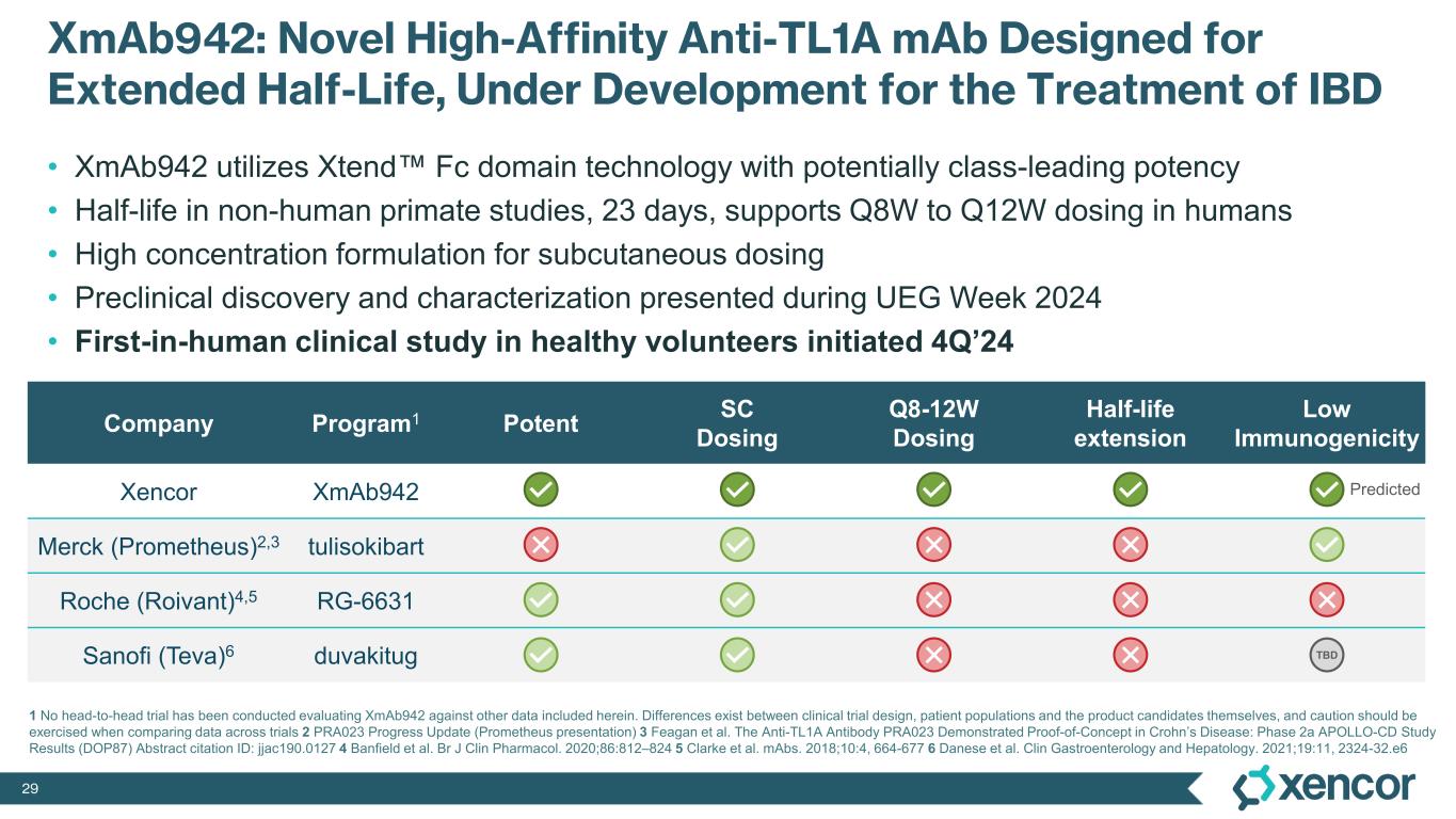 29 XMAB942:设计用于延长半衰期的新型高亲和力抗TL1A MAB,正在开发中,用于治疗IBD • XMAB942利用XTend FC域技术,具有潜在的一流效力•非人类灵长类动物研究中的半衰期,23天,支持Q8W至Q12W人体给药•皮下给药的高浓度剂型• UEG 2024年周期间展示的临床前发现和表征•在健康志愿者中启动的首次人体临床研究启动了4Q'24公司计划1有效SC给药Q8-12W给药延长半衰期低免疫原性Xencor XMAB942丨默沙东(Prometheus)2,3 tulisokibart Roche(Roivant)4,5 RG-6631丨赛诺菲赛诺菲(Teva)6 duvakitug待定1尚未进行针对此处包含的其他数据评估XMAB942的头对头试验。临床试验设计、患者群体和候选产品本身之间存在差异,在比较跨试验的数据时应谨慎行事2 PRA023进展更新(Prometheus presentation)3 Feagan等人。抗TL1A抗体PRA023在克罗恩病中证明了概念验证:2a期APOLLO-CD研究结果(DOP87)摘要引用ID:jjac190.0127 4 Banfield等人Br J Clin Pharmacol。2020;86:812 – 8245 Clarke等人的单抗。2018;10:4,664-677 6 Danese et al. Clin Gastroenterology and Hepatology。2021;19:11,2324-32.e6