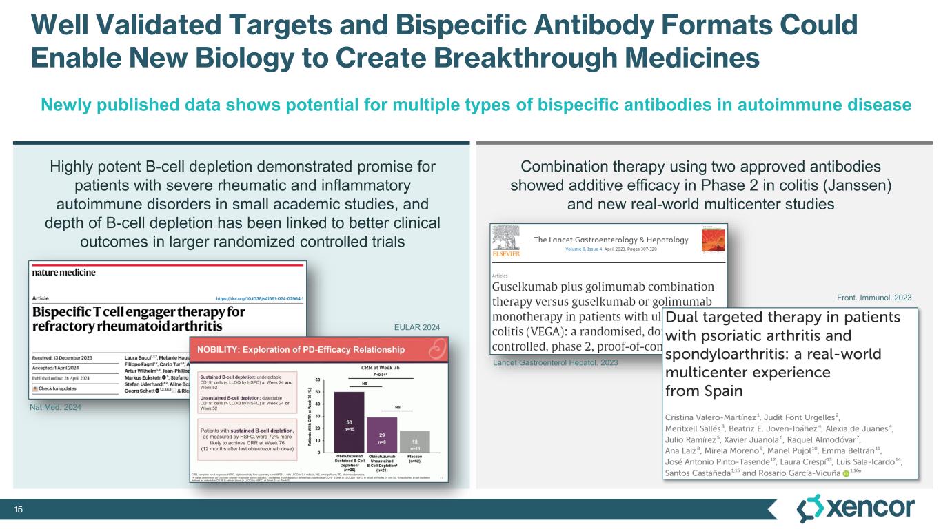 15个经过良好验证的靶点和双特异性抗体形式可使新生物学创造突破性药物使用两种已获批准的抗体的联合疗法在结肠炎(杨森)的2期中显示出相加的功效,新的真实世界多中心研究在小型学术研究中,高效B细胞耗竭证明了对患有严重风湿性和炎症性自身免疫性疾病的患者的前景,在更大的随机对照试验中,B细胞耗竭的深度与更好的临床结果有关新公布的数据显示,多种类型的双特异性抗体在自身免疫性疾病NAT Med中具有潜力。2024 EULAR 2024前沿。免疫力。2023 Lancet Gastroenterol Hepatol。2023