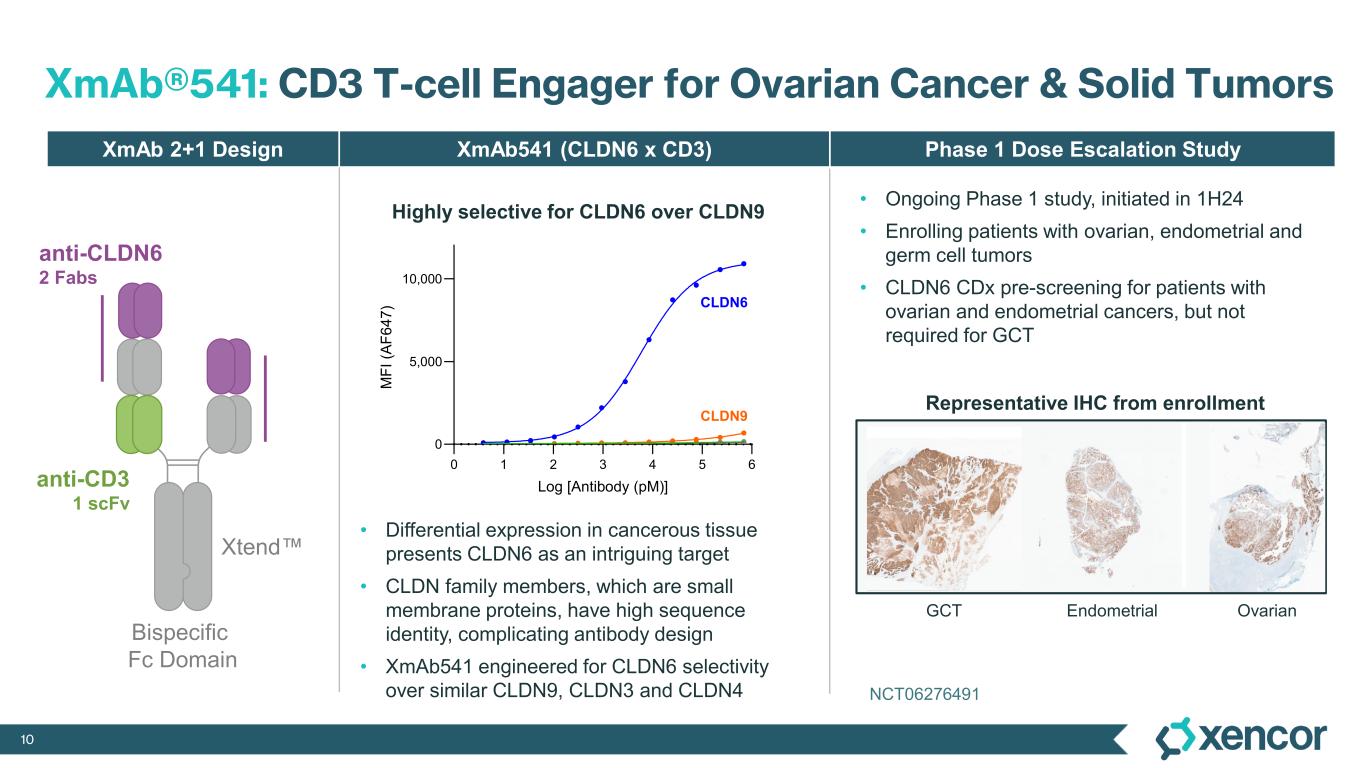 9 XMAB®819:CD3 T细胞接合剂用于肾细胞癌1期,鼓励在cCRCC XMAB819(ENPP3 x CD3)1期剂量递增研究中持续剂量递增的初步数据选择性T细胞定向细胞毒性Hi ENPP3 Lo ENPP3 XMAB 2 + 1设计ENPP3:高RCC;低健康组织•复发/难治性透明细胞RCC中持续的剂量递增•在cCRCC中近乎一致的高ENPP3表达•平行进行,每周静脉内和皮下队列给药,有启动和递增剂量•在确定RPTD后,计划在具有高ENPP3表达的cCRCC和其他组织学中扩展队列•正在开发用于其他组织学中潜在患者选择的伴随诊断•正在对扩展到其他肿瘤类型进行评估在剂量递增中观察到(2024年9月9日更新)•在最近的队列中有明确的抗肿瘤活性初步证据,包括RECIST应答•早期剂量队列中的几名患者的治疗持续时间已超过一年•细胞因子释放综合征(CRS)可控•未达到MTD;最近剂量队列的耐受性继续支持剂量递增•研究人员仍然高度参与,并迅速加入新剂量队列•临床更新和首次剂量扩展队列预计将在1H'25期间开始双特异性FC域抗ENPP3 2 Fabs NCT05433142抗CD3 1 SCFV