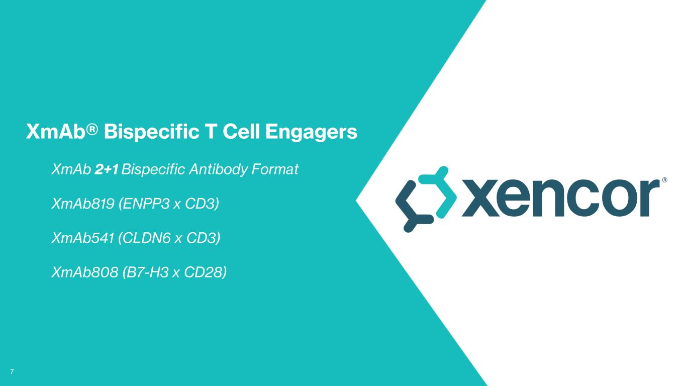 7®XMAB®双特异性T细胞接合剂XMAB2 + 1双特异性抗体格式XMAB819(ENPP3 x CD3)XMAB541(CLDN6 x CD3)XMAB808(B7-H3 x CD28)