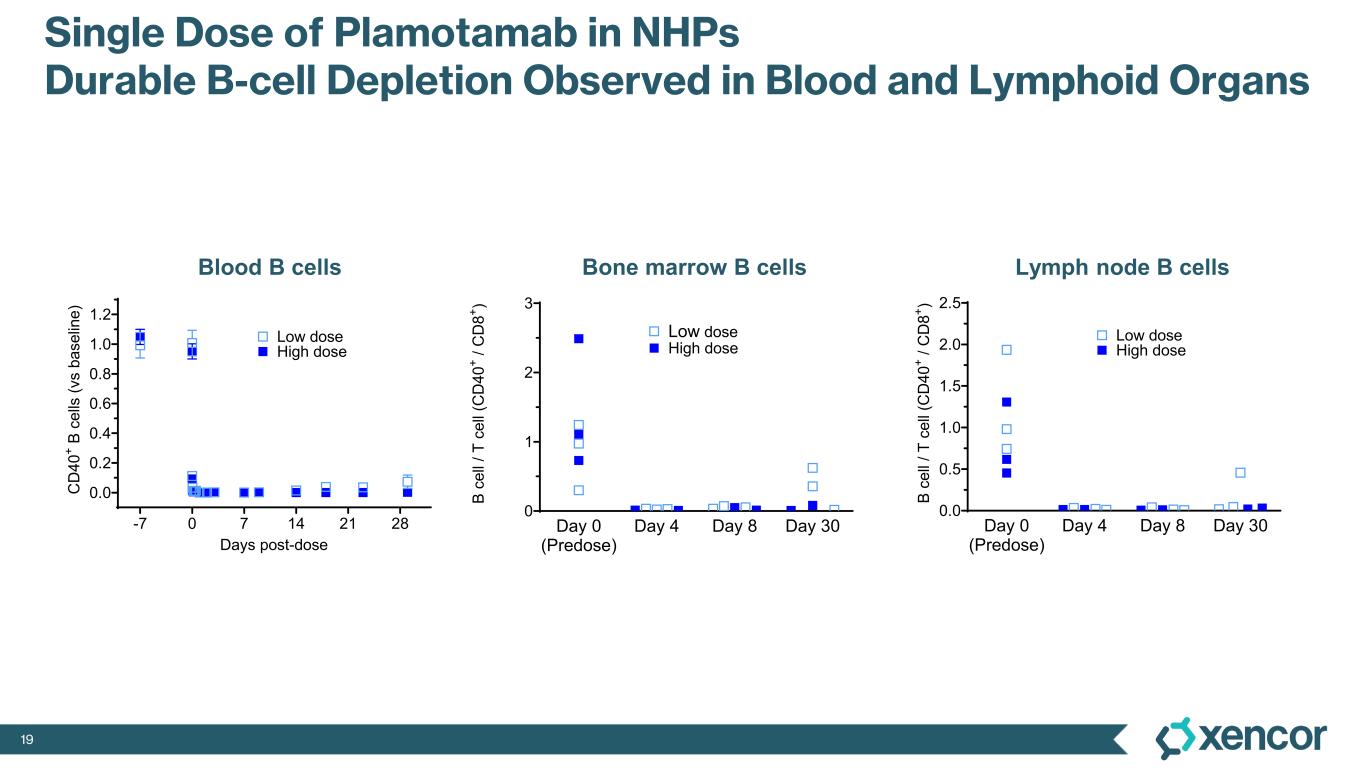 19日第0天(剂量前)第4天第8天第300123 B ce ll/T c el l(C D 40 +/C D 8 +)低剂量高剂量单剂量Plamotamab在NHPs中的血液中观察到的持久B细胞耗竭和淋巴器官血B细胞淋巴结B细胞骨髓B细胞给药后天数C D 40 + B c el ls(v s ba se lin e)-7 071421280.0 0.2 0.4 0.6 0.8 1.0 1.2低剂量高剂量第0天(前体)第4天第8天第30天0.0 0.5 1.0 1.5 2.0 2.5 b ce ll/t c el l(c d 40 +/c d 8 +)低剂量高剂量