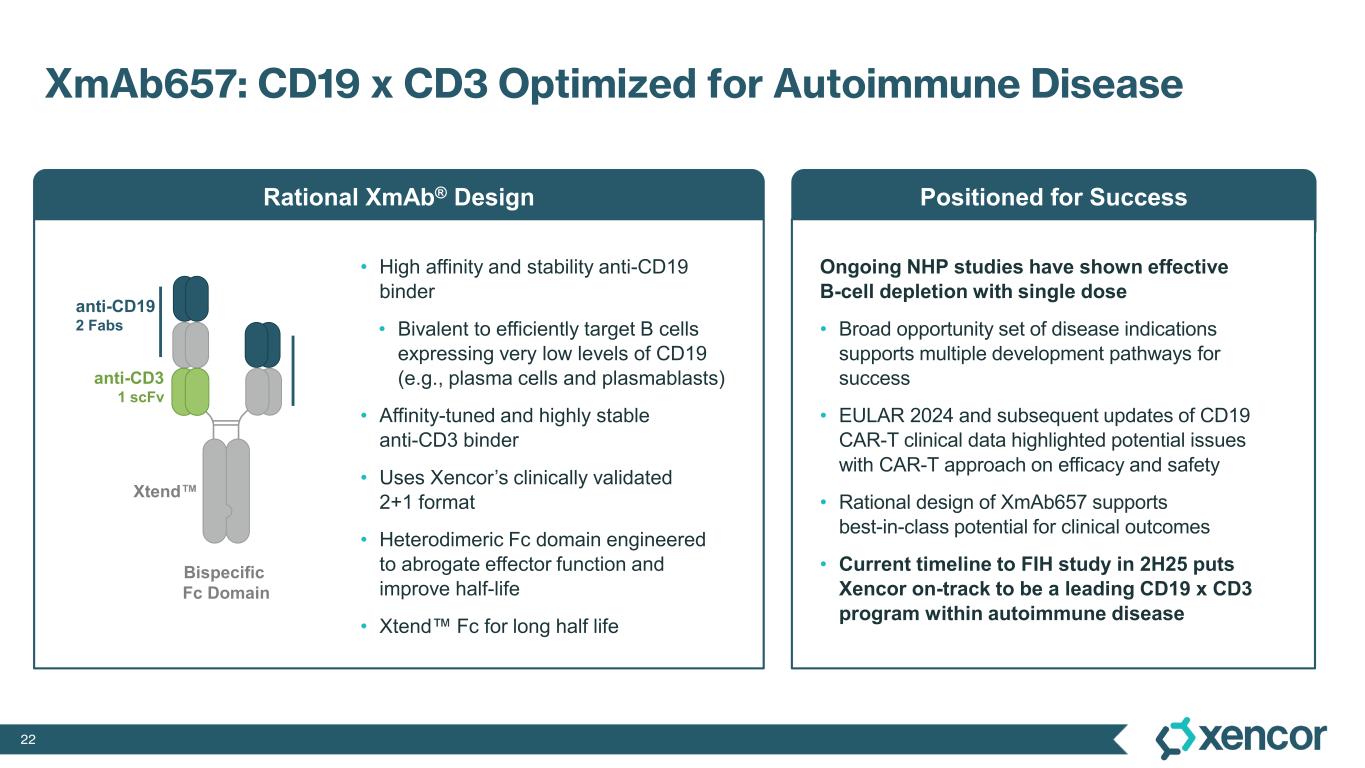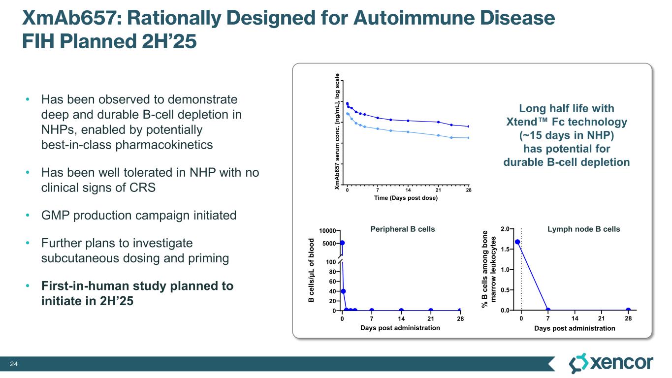 22个定位成功的理性XMAB®设计XMAB657:针对自身免疫性疾病双特异性FC域优化的CD19 x CD3正在进行的NHP研究表明,单剂量可有效消耗B细胞•广泛的疾病适应症机会集支持成功的多种发展途径• EULAR 2024和随后对CD19 CAR-T临床数据的更新突出了CAR-T方法在疗效和安全性方面的潜在问题• XMAB657的合理设计支持临床结果的同类最佳潜力•目前到2H25的FIH研究的时间表使Xencor走上了成为自身免疫性疾病领域领先的CD19 x CD3项目的轨道•高亲和力和稳定性抗CD19结合剂•二价有效靶向表达非常低水平CD19的B细胞(例如浆细胞和浆母细胞)•亲和调节且高度稳定的抗CD3结合剂•使用Xencor临床验证的2 + 1格式•异二聚体FC结构域,旨在消除效应功能并改善半衰期• XTend FC用于长半衰期抗CD3 1 SCFV抗CD19 2 Fabs XTend