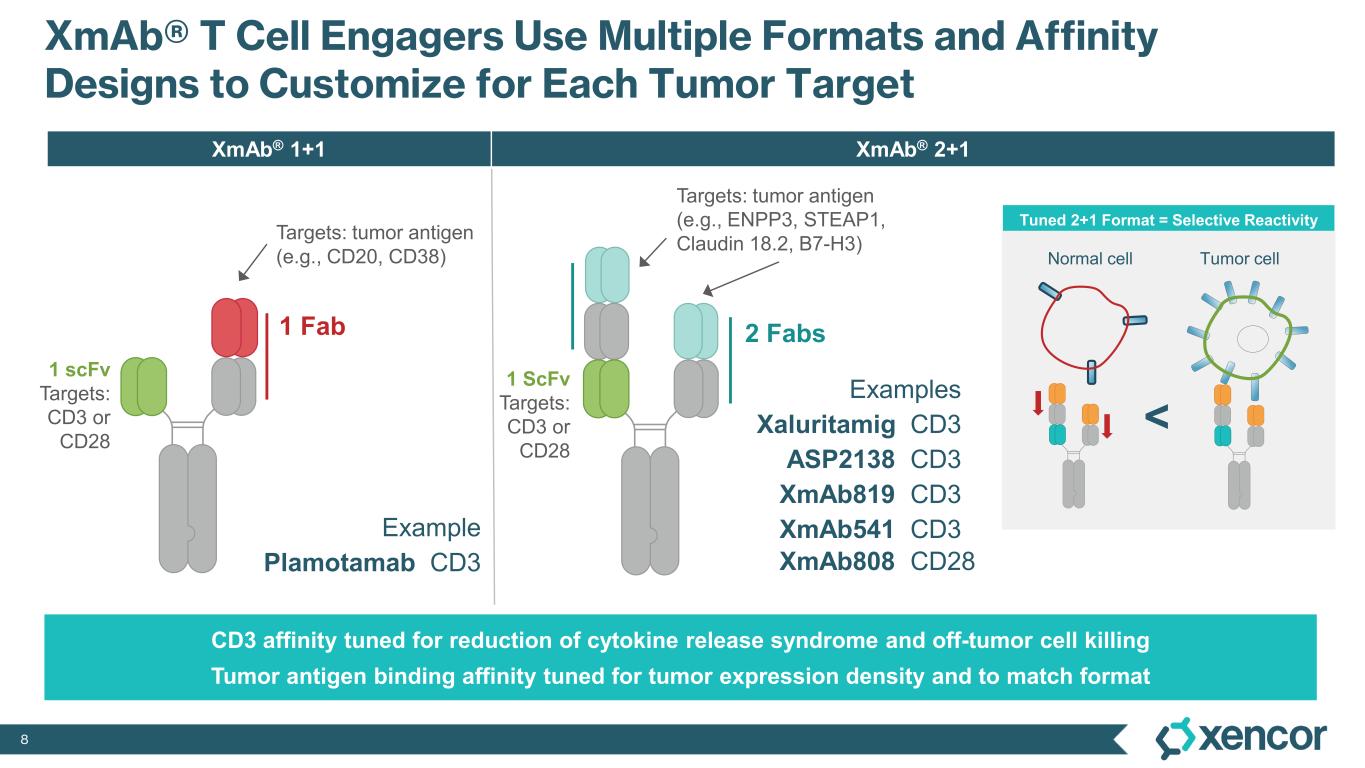 8个XMAB®T细胞接合剂使用多种格式和亲和力设计为每个肿瘤靶点1个SCFV靶点进行定制:CD3或CD28靶点:肿瘤抗原(例如,ENPP3、STEAP1、Claudin 18.2、B7-H3)靶点:肿瘤抗原(例如,CD20、CD38)示例Xaluritamig CD3 ASP2138 CD3 XMAB819 CD3 XMAB541 CD3 CD3亲和力调整用于减少细胞因子释放综合征和非肿瘤细胞杀伤肿瘤抗原结合亲和力调整用于肿瘤表达密度并匹配格式示例Plamotamab CD3 1个SCFV靶点:CD3或CD28 1 Fab 2 Fabs XMAB808 CD28 XMAB®2 + 1XMAB®1 + 1调优2 + 1格式=选择性反应性<肿瘤细胞正常细胞