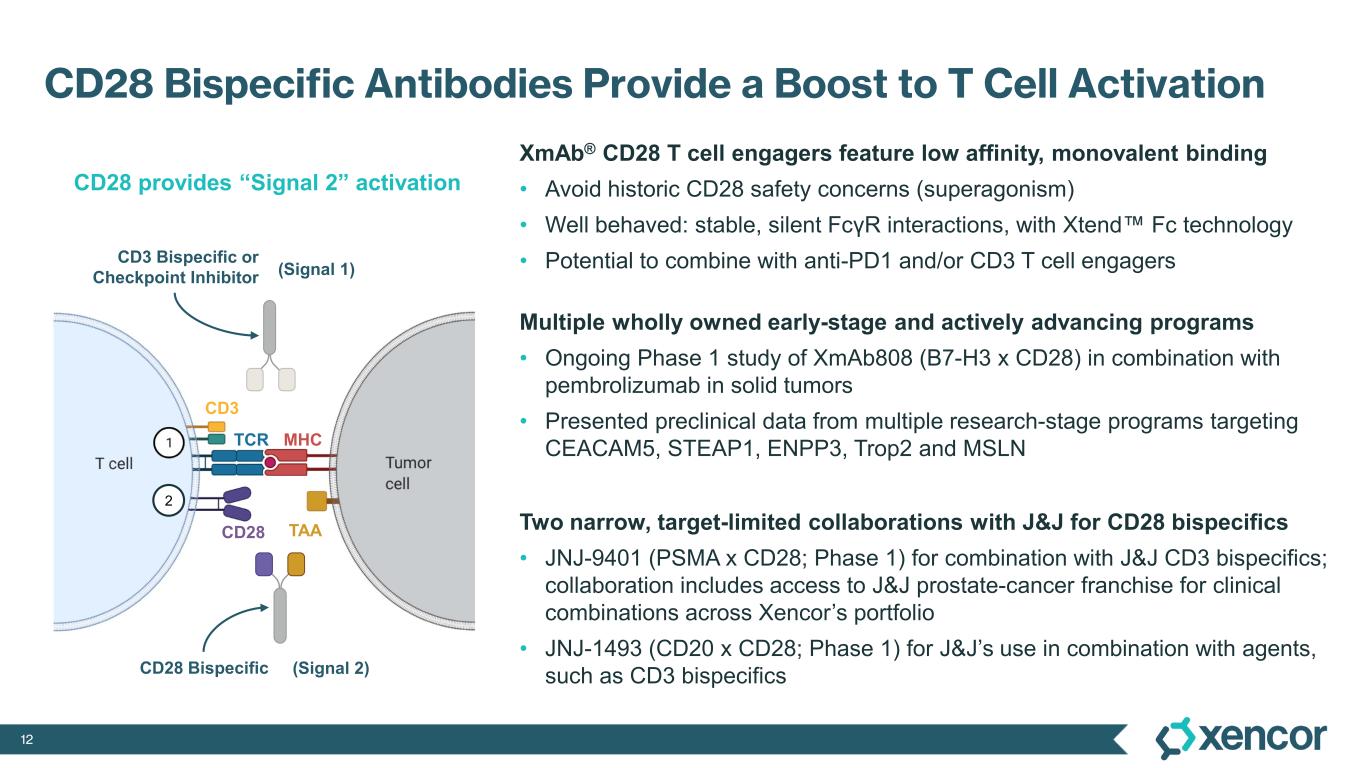 12种CD28双特异性抗体为T细胞活化XMAB提供助推剂®CD28 T细胞接合剂具有低亲和力、单价结合的特点•避免了历史性的CD28安全问题(超级激动)•表现良好:稳定、沉默的FC γ R相互作用,具有XTED FC技术•与抗PD1和/或CD3 T细胞接合剂结合的潜力多个全资早期和积极推进的项目•正在进行的XMAB808(B7-H3 x CD28)联合pembrolizumab治疗实体瘤的1期研究•提供了针对CEACAM5、STEAP1、ENPP3、Trop2和MSLN的多个研究阶段项目的临床前数据,与强生进行CD28双特异性靶点限定合作• JNJ-9401(PSMA x CD28;1期)用于与强生CD3双特异性联合;合作包括获得强生前列腺癌特许经营权,用于跨Xencor产品组合的临床组合• JNJ-1493(CD20 x CD28;1期)用于强生与药物联合使用,例如CD3双特异性CD28提供“信号2”激活(信号1)(信号2)TAA 2 CD3双特异性或检查点抑制剂CD28 CD3 TCR MHC CD28双特异性