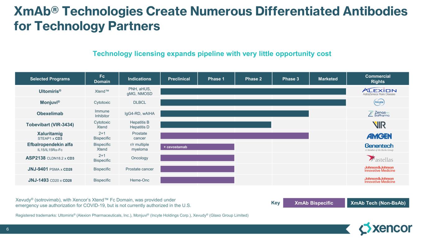 6个XMAB®Technologies为技术合作伙伴创建众多差异化抗体选定项目FC域适应症临床前1期2期3期已上市商业权Ultomiris®XTend PNH、AHUS、GMG、NMOSD Monjuvi®细胞毒性DLBCLObexelimab免疫抑制剂IgG4-RD,WAIHA Tobevibart(VIR-3434)细胞毒性扩展乙型肝炎D型肝炎Xaluritamig STEAP1 x CD3 2 + 1双特异性前列腺癌EFbalropendekin alfa IL15/IL15R α-Fc双特异性扩展r/r多发性骨髓瘤ASP2138CLDN18.2 x CD3 2 + 1双特异性肿瘤学JNJ-9401 PSMA x CD28双特异性前列腺癌JNJ-1493 CD20 x CD28双特异性Heme-Onc技术许可以极少的机会成本扩展管道阿斯利康 Rare Disease + cevostamab XMAb BispecificKey XMAB Tech(non-BSAB)Xevudy®(sotrovimab),具有Xencor的XTend FC域,是根据新冠肺炎紧急使用授权提供的,但目前未在美国获得授权注册商标:Ultomiris®(亚力兄制药公司)、Monjuvi®(因塞特医疗控股公司),Xevudy®(葛兰素史克集团有限公司)