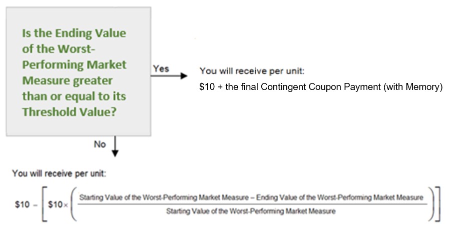 如果没有赎回,在到期时,如果表现最差的市场计量的价格下降不超过30%,本金的回报加上最终的或有息票支付(带内存);否则,从其起始值开始,表现最差的市场计量的1对1下行风险敞口下降,风险高达本金金额的100.00%。