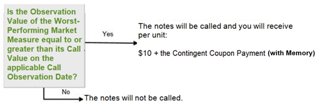 如果在定价日期后大约六个月开始的任何季度调用观察日,表现最差的市场度量的观察值处于或高于其起始值,则自动可调用。如票据被赎回,在适用的赎回付款日期,您将收到票据的本金金额加否则到期的或有息票付款(带内存)。自动呼叫后将不再支付更多金额。