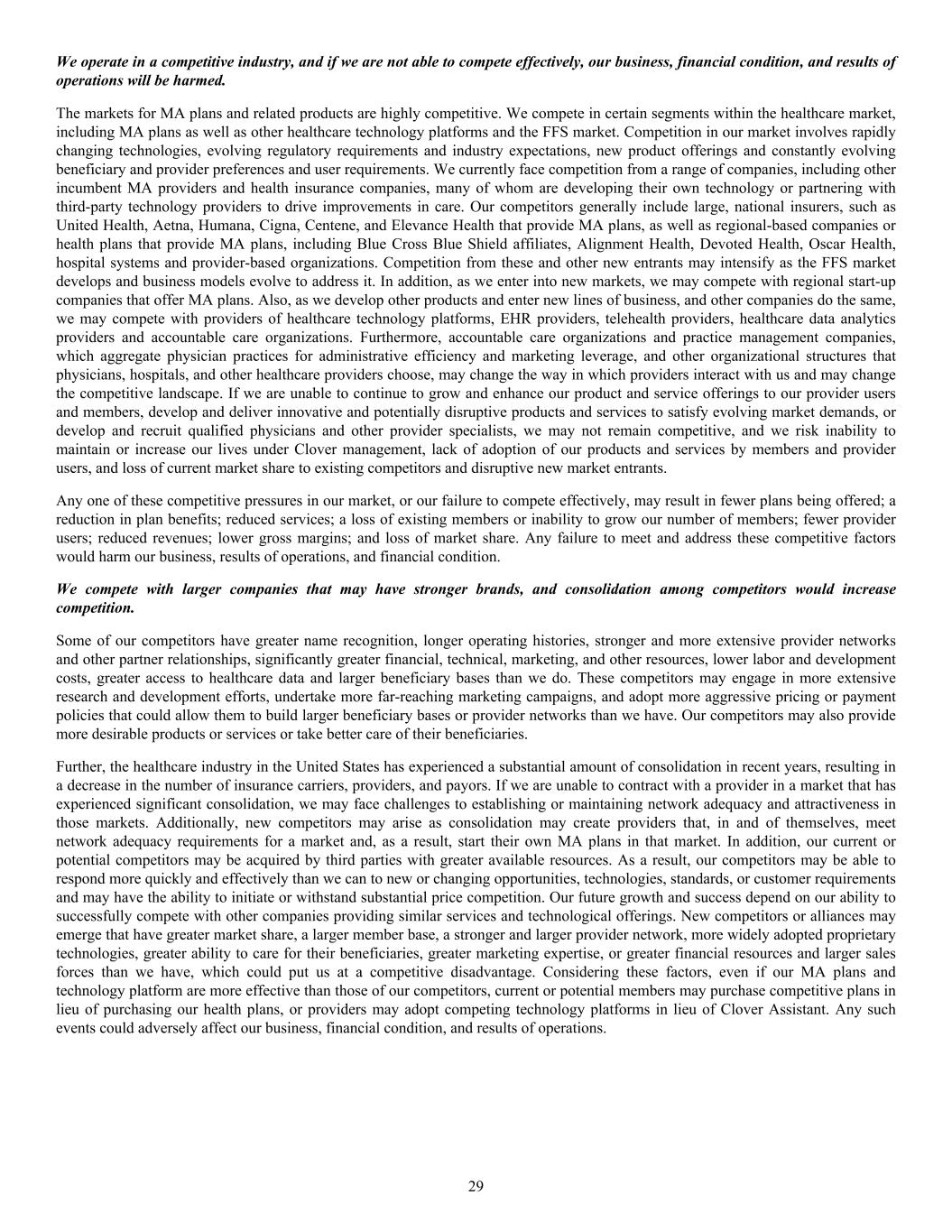 我们在竞争性行业经营,如果不能有效竞争,我们的业务、财务状况、经营成果都会受到损害。MA计划和相关产品的市场竞争激烈。我们在医疗保健市场的某些细分领域展开竞争,包括MA计划以及其他医疗保健技术平台和FFS市场。我们市场的竞争涉及快速变化的技术、不断变化的监管要求和行业期望、新产品的提供以及不断变化的受益人和提供者的偏好和用户要求。我们目前面临一系列公司的竞争,包括其他现有的MA提供商和健康保险公司,其中许多公司正在开发自己的技术或与第三方技术提供商合作,以推动护理的改善。我们的竞争对手通常包括大型全国性保险公司,例如United Health、Aetna、哈门那、信诺、康西哥和Elevance Health这些提供MA计划的公司,以及提供MA计划的区域性公司或健康计划,包括Blue Cross Blue Shield附属公司、Alignment Health、Developed Health、Oscar Health、医院系统和基于供应商的组织。随着FFS市场的发展和商业模式的发展,来自这些和其他新进入者的竞争可能会加剧。此外,随着我们进入新市场,我们可能会与提供MA计划的区域初创公司竞争。此外,随着我们开发其他产品并进入新的业务线,以及其他公司也这样做,我们可能会与医疗保健技术平台提供商、EHR提供商、远程医疗提供商、医疗保健数据分析提供商和责任护理组织展开竞争。此外,负责任的护理组织和实践管理公司,它们为行政效率和营销杠杆聚合医生实践,以及医生、医院和其他医疗保健提供者选择的其他组织结构,可能会改变提供者与我们互动的方式,并可能改变竞争格局。如果我们无法继续发展和增强我们向供应商用户和会员提供的产品和服务,开发和交付创新的和具有潜在颠覆性的产品和服务以满足不断变化的市场需求,或开发和招聘合格的医生和其他供应商专家,我们可能无法保持竞争力,我们可能无法在Clover管理下维持或增加我们的生命,会员和供应商用户缺乏对我们的产品和服务的采用,以及现有竞争对手和颠覆性的新市场进入者失去当前市场份额。我们市场的这些竞争压力中的任何一个,或者我们未能有效竞争,都可能导致提供的计划减少;计划收益减少;服务减少;现有会员流失或无法增加我们的会员数量;供应商用户减少;收入减少;毛利率下降;以及市场份额损失。任何未能满足和解决这些竞争因素都将损害我们的业务、经营业绩和财务状况。我们与可能拥有更强品牌的大公司竞争,竞争对手之间的合并将增加竞争。我们的一些竞争对手比我们拥有更大的知名度、更长的运营历史、更强大和更广泛的供应商网络和其他合作伙伴关系、显着更多的财务、技术、营销和其他资源、更低的劳动力和开发成本、更多的医疗保健数据访问和更大的受益基础。这些竞争对手可能会从事更广泛的研发工作,开展更深远的营销活动,并采取更激进的定价或支付政策,这可能使他们能够建立比我们更大的受益基或供应商网络。我们的竞争对手也可能提供更理想的产品或服务,或更好地照顾他们的受益者。此外,美国医疗保健行业近年来经历了大量的整合,导致保险公司、提供者和付款人的数量减少。如果我们无法与经历重大整合的市场中的供应商签订合同,我们可能会面临在这些市场建立或维持网络充足性和吸引力的挑战。此外,新的竞争对手可能会出现,因为合并可能会产生供应商,这些供应商本身满足市场的网络充分性要求,并因此在该市场启动自己的MA计划。此外,我们目前或潜在的竞争对手可能会被拥有更多可用资源的第三方收购。因此,我们的竞争对手可能能够比我们更快、更有效地对新的或不断变化的机会、技术、标准、 或客户要求,并可能有能力发起或承受实质性的价格竞争。我们未来的增长和成功取决于我们与其他提供类似服务和技术产品的公司成功竞争的能力。可能会出现新的竞争对手或联盟,它们拥有更大的市场份额、更大的会员基础、更强大和更大的供应商网络、更广泛采用的专有技术、更大的照顾受益者的能力、更强的营销专业知识,或者比我们拥有更多的财政资源和更大的销售力量,这可能会使我们处于竞争劣势。考虑到这些因素,即使我们的MA计划和技术平台比我们的竞争对手更有效,当前或潜在的成员可能会购买竞争性计划而不是购买我们的健康计划,或者提供者可能会采用竞争性技术平台来代替Clover Assistant。任何此类事件都可能对我们的业务、财务状况和经营业绩产生不利影响。29