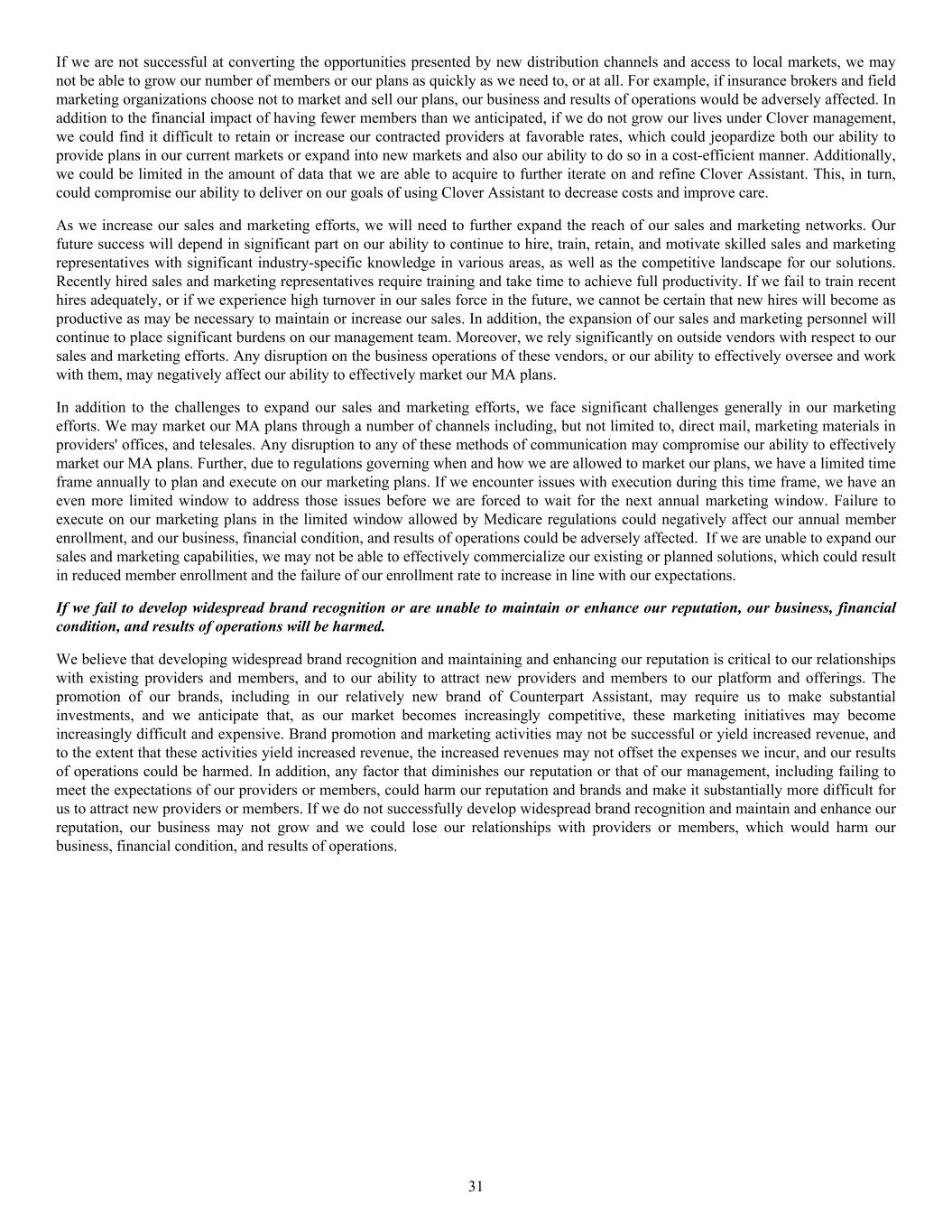 如果我们不能成功地转换新的分销渠道和进入当地市场所带来的机会,我们可能无法像我们需要的那样迅速地增加我们的会员数量或我们的计划,或者根本无法做到。例如,如果保险经纪人和现场营销组织选择不营销和销售我们的计划,我们的业务和经营结果将受到不利影响。除了成员数量少于我们预期的财务影响之外,如果我们不在Clover管理下发展我们的生活,我们可能会发现很难以优惠的价格保留或增加我们的签约供应商,这可能会危及我们在当前市场提供计划或扩展到新市场的能力,也可能危及我们以具有成本效益的方式这样做的能力。此外,我们能够获取的数据量可能会受到限制,以进一步迭代和完善Clover Assistant。反过来,这可能会影响我们实现使用Clover Assistant降低成本和改善护理的目标的能力。随着我们加大销售和营销力度,我们将需要进一步扩大我们的销售和营销网络的覆盖范围。我们未来的成功将在很大程度上取决于我们继续聘用、培训、留住和激励在各个领域具有重要行业特定知识的熟练销售和营销代表的能力,以及我们解决方案的竞争格局。最近聘用的销售和营销代表需要培训,并且需要时间来实现全面的生产力。如果我们未能对最近的员工进行充分培训,或者如果我们在未来的销售队伍中经历了高流动率,我们无法确定新员工将变得像维持或增加我们的销售额所需要的那样富有成效。此外,我们销售和营销人员的扩张将继续给我们的管理团队带来重大负担。此外,在我们的销售和营销努力方面,我们严重依赖外部供应商。这些供应商的业务运营受到任何干扰,或者我们有效监督和与他们合作的能力,都可能对我们有效营销MA计划的能力产生负面影响。除了扩大我们的销售和营销努力所面临的挑战之外,我们在营销努力方面普遍面临重大挑战。我们可能会通过多种渠道营销我们的MA计划,包括但不限于直邮、供应商办公室的营销材料以及电话销售。任何这些沟通方式的中断都可能损害我们有效推销MA计划的能力。此外,由于有关何时以及如何允许我们营销我们的计划的规定,我们每年有一个有限的时间范围来计划和执行我们的营销计划。如果我们在这个时间范围内遇到执行方面的问题,在我们被迫等待下一个年度营销窗口之前,我们有一个更加有限的窗口来解决这些问题。未能在医疗保险法规允许的有限窗口内执行我们的营销计划可能会对我们的年度会员注册产生负面影响,我们的业务、财务状况和经营业绩可能会受到不利影响。如果我们无法扩大我们的销售和营销能力,我们可能无法有效地将我们现有或计划中的解决方案商业化,这可能导致会员注册人数减少,以及我们的注册率未能按照我们的预期增长。如果我们未能发展广泛的品牌认知度或无法维持或提高我们的声誉,我们的业务、财务状况和经营结果将受到损害。我们认为,发展广泛的品牌认知度以及维持和提高我们的声誉对于我们与现有供应商和会员的关系以及我们吸引新供应商和会员加入我们的平台和产品的能力至关重要。推广我们的品牌,包括在我们相对较新的品牌Counterpart Assistant中,可能需要我们进行大量投资。我们预计,随着我们的市场竞争日益激烈,这些营销举措可能会变得越来越困难和昂贵。品牌推广和营销活动可能不会成功或产生增加的收入,如果这些活动产生增加的收入,增加的收入可能无法抵消我们产生的费用,我们的经营业绩可能会受到损害。此外,任何降低我们或管理层声誉的因素,包括未能达到供应商或会员的期望,都可能损害我们的声誉和品牌,并使我们更难吸引新的供应商或会员。如果我们不能成功地发展广泛的品牌认知度并保持和提高我们的声誉,我们的业务可能不会增长,我们可能会失去与供应商或会员的关系, 这将损害我们的业务、财务状况和经营业绩。31