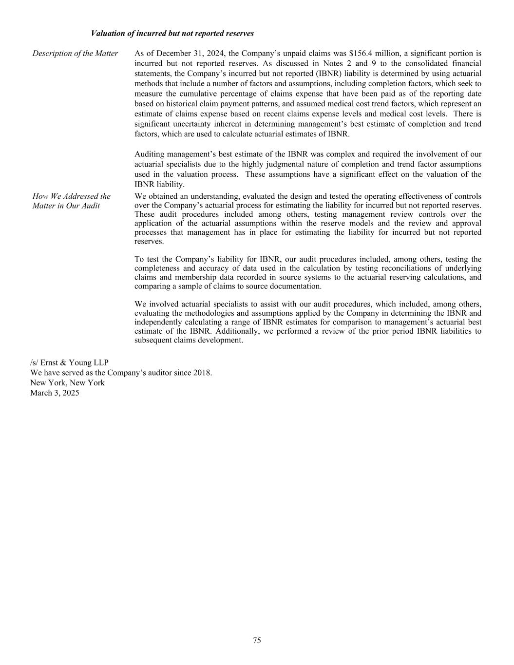 已发生但未报告的准备金的估值事项说明截至2024年12月31日,公司未支付的索赔为1.564亿美元,很大一部分是已发生但未报告的准备金。如合并财务报表附注2和9所述,公司的已发生但未报告(IBNR)负债是通过使用精算方法确定的,其中包括一些因素和假设,包括完成因素,这些因素寻求根据历史索赔支付模式衡量截至报告日已支付的索赔费用的累计百分比,以及假定的医疗成本趋势因素,这些因素代表根据最近的索赔费用水平和医疗成本水平对索赔费用的估计。在确定管理层对完工和趋势因素的最佳估计时存在很大的内在不确定性,这些因素用于计算IBNR的精算估计。审计管理层对IBNR的最佳估计是复杂的,由于估值过程中使用的完成和趋势因素假设的高度判断性,需要我们的精算专家的参与。这些假设对IBNR负债的估值有显著影响。我们如何在审计中处理该事项我们获得了理解,评估了设计并测试了对公司估计已发生但未报告准备金负债的精算过程的控制的运营有效性。这些审计程序除其他外,包括测试管理层对准备金模型内精算假设的应用的审查控制,以及管理层为估计已发生但未报告的准备金的负债而制定的审查和批准程序。为了测试公司对IBNR的责任,我们的审计程序包括,除其他外,通过测试源系统中记录的基础索赔和成员数据与精算准备金计算的对账,以及将索赔样本与源文件进行比较,测试计算中使用的数据的完整性和准确性。我们请精算专家协助我们的审计程序,其中包括,除其他外,评估公司在确定IBNR时采用的方法和假设,并独立计算一系列IBNR估计,以便与管理层对IBNR的精算最佳估计进行比较。此外,我们对前期IBNR负债与后续索赔发展进行了审查。/s/Ernst & Young LLP我们自2018年起担任公司的审计师。纽约、纽约2025年3月3日75