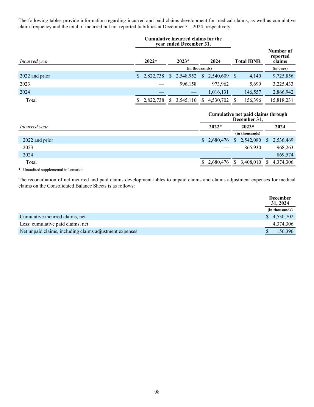 下表分别提供了关于医疗索赔的已发生和已支付索赔发展的信息,以及截至2024年12月31日的累计索赔频率和已发生但未报告的负债总额:截至2022年12月31日止年度的累计已发生索赔*2023*2024年IBNR总额报告的索赔件数(千件)(以件计)2022及以前$ 2,822,738 $ 2,548,952 $ 2,540,609 $ 4,1409,725,8562023 — 996,158973,9625,6993,225,4332024 — — 1,016,131146,5572,866,942总计$ 2,822,738 $ 3,545,110 $ 4,530,702 $ 156,39615,818,231截至12月31日的累计已付索赔净额,发生年份2022*2023*2024年(单位:千)2022年及以前2680476美元2542080美元25364692023 — 8659309682632024 —— 869574总计2680476美元3408010美元4374306美元*未经审计的补充资料合并资产负债表上医疗索赔的已发生和已付索赔净额发展表与未付索赔和索赔调整费用的对账如下:2024年12月31日(单位:千)累计已发生索赔,净额4530702美元减:累计已付索赔,净额4374306未付索赔净额,包括索赔调整费用15639698美元