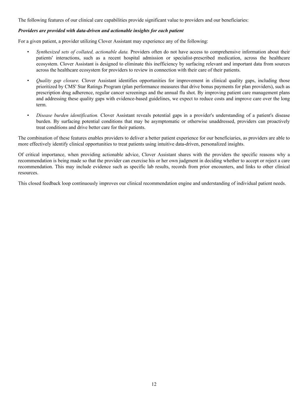 我们的临床护理能力的以下特点为提供者和我们的受益人提供了重要价值:为给定患者的每个患者提供数据驱动和可操作的见解,使用Clover Assistant的提供者可能会经历以下任何一种情况:•综合整理的、可操作的数据集。医疗保健生态系统中的提供者通常无法获得有关其患者互动的全面信息,例如最近的入院或专家开具的药物。Clover Assistant旨在消除这种低效率,方法是将来自整个医疗保健生态系统来源的相关重要数据堆叠起来,供提供者在其对患者的护理方面进行审查。•质量差距闭合。Clover Assistant确定了改善临床质量差距的机会,包括那些被CMS星级评定计划(推动计划提供者奖金支付的计划绩效衡量标准)优先考虑的机会,例如处方药依从性、定期癌症筛查和年度流感疫苗。通过改善患者护理管理计划并通过循证指南解决这些质量差距,我们预计将降低成本并长期改善护理。•疾病负担鉴定。Clover Assistant揭示了提供者在理解患者疾病负担方面的潜在差距。通过将可能无症状或以其他方式未得到解决的潜在情况浮出水面,提供者可以主动治疗疾病并推动对患者的更好护理。这些功能的结合使提供者能够为我们的受益人提供更好的患者体验,因为提供者能够更有效地识别临床机会,使用直观的数据驱动的个性化洞察来治疗患者。至关重要的是,在提供可采取行动的建议时,Clover Assistant与提供者分享提出建议的具体原因,以便提供者在决定是否接受或拒绝护理建议时行使自己的判断力。这可能包括特定实验室结果、先前遭遇的记录以及与其他临床资源的链接等证据。这个闭合反馈回路不断完善我们的临床推荐引擎和对个体患者需求的理解。12