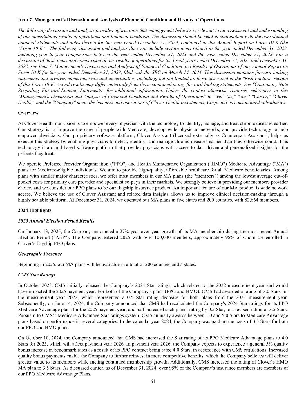 项目7。管理层对财务状况和经营成果的讨论与分析。以下讨论和分析提供了管理层认为与评估和理解我们的综合经营业绩和财务状况相关的信息。有关讨论应与本年度报告10-K表格(“10-K表格”)所载截至2024年12月31日止年度的综合财务报表及其附注一并阅读。以下讨论和分析不包括与截至2023年12月31日止年度相关的某些项目,包括截至2023年12月31日止年度与截至2022年12月31日止年度之间的年度比较。有关这些项目的讨论以及我们截至2023年12月31日和2022年12月31日的财政年度的经营业绩比较,请参阅项目7。管理层对财务状况和运营结果的讨论和分析我们于2024年3月14日向SEC提交的截至2023年12月31日止年度的10-K表格年度报告。本讨论包含前瞻性陈述,涉及众多风险和不确定性,包括但不限于本10-K表“风险因素”部分中描述的风险和不确定性。实际结果可能与任何前瞻性陈述中包含的结果存在重大差异。有关更多信息,请参阅“关于前瞻性陈述的注意事项”。除文意另有所指外,本“管理层对财务状况和经营成果的讨论与分析”中提及的“我们”、“我们”、“我们的”、“三叶草”、“Clover Health”及“公司”均指Clover Health Investments, Corp.及其合并子公司的业务和经营情况。综述在Clover Health,我们的愿景是让每一位医生都能拥有更早识别、管理和治疗慢性病的技术。我们的战略是改善医疗保险患者的护理,发展广泛的医生网络,并提供技术帮助赋予医生权力。我们的专有软件平台Clover Assistant(外部授权为Counterpart Assistant)通过使医生能够比其他方式更早地发现、识别和管理慢性疾病,帮助我们执行这一策略。这项技术是一个基于云的软件平台,可为医生提供访问数据驱动和个性化见解的途径,供他们治疗的患者使用。我们为符合Medicare资格的个人运营Preferred Provider Organization(“OPPO”)和Health Maintenance Organization(“HMO”)Medicare Advantage(“MA”)计划。我们的目标是为所有医疗保险受益人提供高质量、负担得起的医疗保健。在具有类似主要特征的计划中,我们为MA计划中的大多数成员(“成员”)提供了其市场上初级保健提供者和专家共同支付的最低平均自付费用。我们坚信为我们的会员提供提供商选择,我们认为我们的OPPO计划是我们的旗舰保险产品。我们的MA产品的一个重要特点是网络接入广泛。我们相信,Clover Assistant和相关数据洞察的使用使我们能够通过高度可扩展的平台改进临床决策。截至2024年12月31日,我们在五个州和200个县实施了MA计划,有82,664名成员。2024 Highlights 2025 Annual Election Period Results On January 13,2025,the company announced that in the latest annual election period(“AEP”),its MA membership increased by 27% year-on-year in the latest annual election period(该公司进入2025年,拥有超过10万名会员,其中约95%的会员参加了Clover的旗舰OPPO计划。地理存在从2025年开始,我们的MA计划将在总共200个县和5个州提供。康哲药业星级评级2023年10月,康哲药业最初发布了该公司的2024年星级评级,该评级与2022计量年度相关,并将影响2025付款年度。对于该公司的两个计划(OPPO和HMO),康哲药业在2022年的计量年度获得了3.0星的评级,这意味着这两个计划的评级均较2021年计量年度下降了0.5星。随后,公司于2024年6月14日宣布,康哲药业重新计算了公司2025年支付年度的OPPO Medicare Advantage计划的2024年星级评级,并将此类计划的评级提高了0.5星,修正后的评级为3.5星。根据CMS的Medicare Advantage星级评级系统,CMS每年根据几个类别的表现向Medicare Advantage计划授予1.0至5.0星级。在2024日历年,公司在我们的OPPO和HMO计划中均按3.5星支付。2024年10月10日,公司宣布康哲药业将其OPPO医保优势计划的星级提高到2025年的4.0星,这将影响到2026年的支付。在支付年份2026年, 根据CMS的规定,由于其OPPO合同被评为4.0星,该公司预计将经历基准费率普遍5%的质量奖金增长。更高质量的奖金支付使公司能够进一步再投资于更具竞争力的福利,公司认为这将为其会员带来更大的价值,同时推动会员的持续增长。此外,康哲药业将三叶草的HMO MA计划评级提高至3.5星。如前所述,截至2024年12月31日,公司超过95%的保险成员是我们的OPPO医疗保险优势计划的成员。61