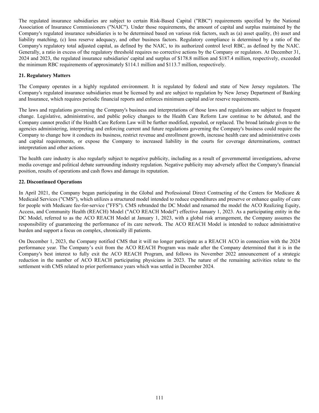 受监管的保险子公司须遵守美国全国保险专员协会(“NAIC”)规定的某些基于风险的资本(“RBC”)要求。在这些要求下,公司受监管的保险子公司维持资本和盈余的金额将根据各种风险因素确定,例如(a)资产质量,(b)资产负债匹配,(c)损失准备金充足性,以及其他业务因素。监管合规性由NAIC定义的公司监管调整后资本总额与NAIC定义的授权控制水平RBC的比率决定。一般来说,超过监管门槛的比率不需要公司或监管机构采取纠正行动。截至2024年12月31日和2023年12月31日,受监管保险子公司的资本和盈余分别为1.788亿美元和1.874亿美元,分别超过RBC最低要求约1.141亿美元和1.137亿美元。21.监管事项公司在高度监管的环境中运营。它受到联邦和新泽西州监管机构的监管。公司受监管的保险子公司必须获得新泽西州银行和保险部的许可并受其监管,这要求定期财务报告并执行最低资本和/或准备金要求。规范公司业务的法律法规及对该等法律法规的解释经常发生变化。医改法的立法、行政、公共政策变化持续争论,公司无法预测医改法是否会进一步修改、废除或取代。给予管理、解释和执行当前和未来管理公司业务的法规的机构广泛的自由度可能要求公司改变其开展业务的方式,限制收入和入学人数的增长,增加医疗保健和行政成本以及资本要求,或使公司在法庭上因承保范围确定、合同解释和其他行动而承担更多的责任。医疗保健行业也经常受到负面宣传,包括政府调查、媒体负面报道和围绕行业监管的政治辩论的结果。负面宣传可能会对公司的财务状况、经营业绩和现金流量产生不利影响,并损害其声誉。22.公司于2021年4月停止运营,开始参与医疗保险和医疗补助服务中心(“CMS”)的全球和专业直接签约,该中心采用结构化模式,旨在减少支出,保持或提高医疗保险按服务收费(“FFS”)人群的护理质量。CMS将DC模式重新命名,并将该模式更名为ACO实现公平、准入和社区健康(REACH)模式(“ACO REACH模式”),自2023年1月1日起生效。公司作为DC模型(2023年1月1日简称ACO REACH模型)的参与实体,具有全球风险安排,承担保障其护理网络性能的责任。ACO REACH模式旨在减轻行政负担,支持关注复杂的慢性病患者。2023年12月1日,公司通知康哲药业,其将不再作为与2024年业绩年度相关的REACH ACO参与。公司退出ACO REACH计划是在公司确定完全退出ACO REACH计划符合公司最佳利益后,并在其2022年11月宣布在2023年战略性减少ACO REACH参与医生人数之后进行的。其余活动的性质涉及与CMS有关的先前业绩年度的结算,该结算已于2024年12月结算。111