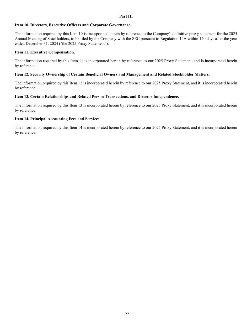 第三部分第10项。董事、执行官和公司治理。本第10项要求的信息通过参考公司2025年年度股东大会的最终代理声明并入本文,该声明将由公司根据第14A条在截至2024年12月31日止年度后的120天内向SEC提交(“2025年代理声明”)。项目11。高管薪酬。第11项要求的信息通过引用我们的2025年代理声明并入本文,并通过引用并入本文。项目12。某些受益所有人的安全所有权和管理层及相关股东事项。本项目12所要求的信息通过引用我们的2025年代理声明并入本文,并通过引用并入本文。项目13。某些关系和关联人交易,以及董事独立性。本项目13所要求的信息通过引用我们的2025年代理声明并入本文,并通过引用并入本文。项目14。主要会计费用和服务。第14项要求的信息通过引用我们的2025年代理声明并入本文,并通过引用并入本文。122
