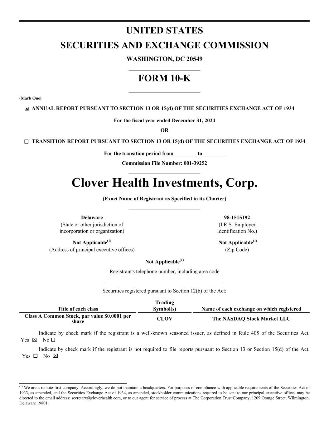 美国证券交易委员会华盛顿特区20549_________________________________________________表格10-k ______________________________________(标记一)根据1934年证券交易法第13或15(d)条提交的截至2024年12月31日的财政年度的年度报告或根据第13或15条提交的过渡报告Corp.(注册人的确切名称在其章程中指定)_____________________________________特拉华州98-1515192(州或公司或组织的其他司法管辖区)(美国国税局雇主识别号)不适用(1)不适用(1)(主要行政办公室地址)(邮编)不适用(1)注册人的电话号码,包括区号______________________________________根据该法第12(b)节注册的证券:各类名称交易代码(s)每个交易所的名称根据《证券法》第405条的定义。是x否o如果根据该法第13条或第15(d)条,注册人无需提交报告,请用复选标记表示。是o否x(1)我们是一家远程优先公司。因此,我们不维持总部。为遵守经修订的1933年《证券法》和经修订的1934年《证券交易法》的适用要求,要求发送至我们主要执行办公室的股东通信可发送至电子邮件地址:secretary@cloverhealth.com,或发送至我们在公司信托公司的流程服务代理人,地址为1209 Orange Street,Wilmington,Delaware 19801。