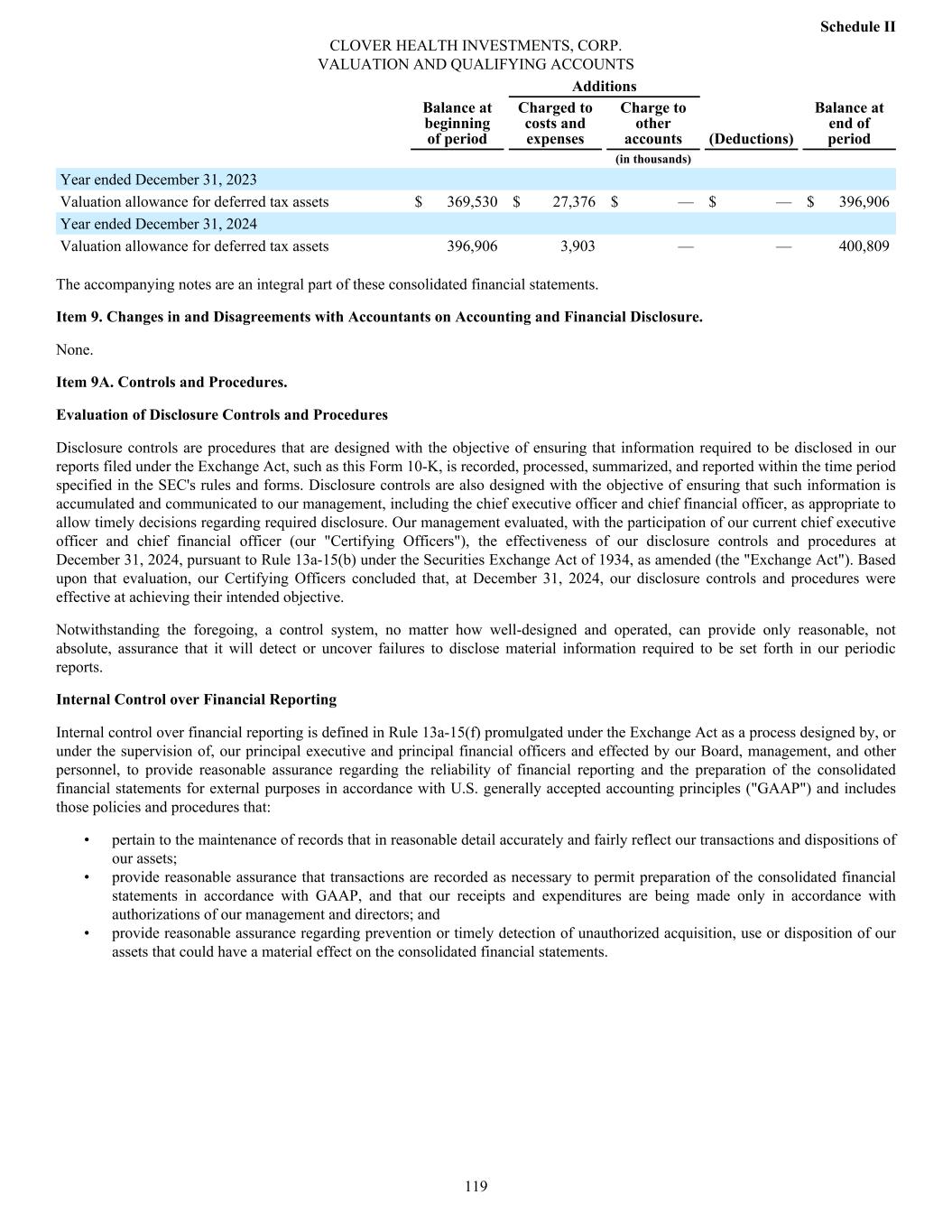 期初余额计入成本和费用计入其他账户(扣除)期末余额(千)截至2023年12月31日止年度递延税项资产估值备抵369,530美元27,376美元— 396,906美元截至2024年12月31日止年度递延税项资产估值备抵396,9063,903 —— 400,809所附附注是这些综合财务报表的组成部分。项目9。会计和财务披露方面的变化和与会计师的分歧。没有。项目9a。控制和程序。对披露控制和程序的评估披露控制是旨在确保我们根据《交易法》提交的报告中要求披露的信息(例如本10-K表格)在SEC规则和表格规定的时间段内记录、处理、汇总和报告的程序。披露控制还旨在确保这些信息得到积累并酌情传达给我们的管理层,包括首席执行官和首席财务官,以便及时做出有关所需披露的决定。根据经修订的1934年《证券交易法》(《交易法》)第13a-15(b)条,我们的管理层在我们现任首席执行官和首席财务官(我们的“核证官”)的参与下,评估了我们在2024年12月31日的披露控制和程序的有效性。根据这一评估,我们的认证官员得出结论,截至2024年12月31日,我们的披露控制和程序有效地实现了其预期目标。尽管有上述规定,一个控制系统,无论设计和操作多么完善,只能提供合理而非绝对的保证,即它将发现或发现未能披露我们定期报告中规定的重大信息。财务报告内部控制财务报告内部控制在根据《交易法》颁布的规则13a-15(f)中定义为由我们的主要行政人员和主要财务官员设计或在其监督下并由我们的董事会、管理层和其他人员实施的流程,就财务报告的可靠性和根据美国公认会计原则(“GAAP”)为外部目的编制合并财务报表提供合理保证,并包括以下政策和程序:•与维护记录有关,这些记录以合理的细节准确和公平地反映我们的交易和对我们资产的处置;•提供合理保证,交易记录是必要的,以允许根据公认会计原则编制合并财务报表,以及我们的收支仅根据我们的管理层和董事的授权进行;•就防止或及时发现可能对综合财务报表产生重大影响的未经授权收购、使用或处置我们的资产提供合理保证。附表II CLOVER Health Investments,CORP。估值和合格账户119