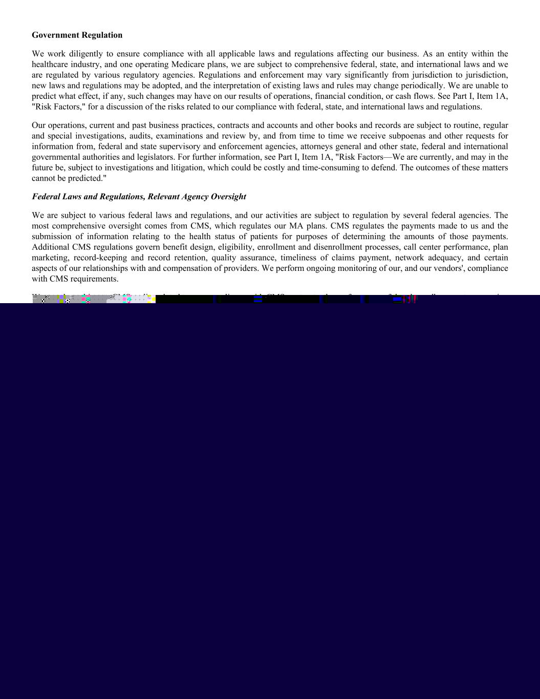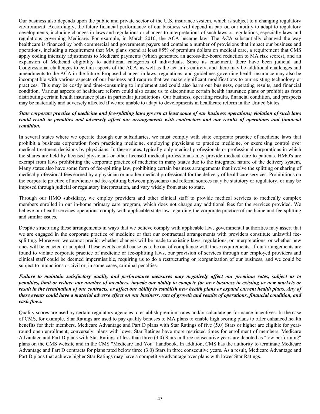 我们的业务还依赖于美国保险体系的公共和私营部门,后者受制于不断变化的监管环境。因此,我们业务未来的财务表现将部分取决于我们适应监管发展的能力,包括法律法规的变化或对此类法律或法规的解释的变化,尤其是有关医疗保险的法律法规。例如,2010年3月,《ACA》成为法律。《ACA》从本质上改变了医疗保健由商业和政府付款人提供资金的方式,其中包含一些影响我们业务和运营的条款,包括要求MA计划将至少85%的保费用于医疗保健,要求CMS对医疗保险支付应用编码强度调整(这导致MA风险评分全面降低),以及将医疗补助资格扩大到其他类别的个人。自颁布以来,一直有司法和国会对ACA的某些方面提出质疑,以及对该法案的整体提出质疑,未来可能会有更多的质疑和对ACA的修订。有关健康保险的法律、法规和指南的拟议变更也可能与我们业务的各个方面不兼容,并要求我们对现有技术或做法进行重大修改。这可能是昂贵和耗时的实施,也可能损害我们的业务、经营成果和财务状况。医疗改革的各个方面也可能导致我们停止某些健康保险计划或禁止我们在特定司法管辖区分发某些健康保险计划。如果我们无法适应美国医疗改革的发展,我们的业务、经营业绩、财务状况和前景可能会受到重大不利影响。国家医药企业实践和分费法至少管辖我们的一些业务运营;违反这些法律可能会导致处罚,并对我们与承包商的安排以及我们的运营结果和财务状况产生不利影响。在我们通过子公司运营的几个州,我们必须遵守禁止商业公司行医、雇用医生行医或对医生的医疗治疗决定行使控制权的州企业行医法。在这些州,通常只有持牌医生或其他持牌医疗专业人员持有股份的医疗专业人员或专业公司才能为患者提供医疗服务。由于递送系统的一体化性质,HMO's在许多州被豁免于禁止企业行医的法律。许多州还制定了某种形式的分费法,禁止某些商业安排涉及医生或其他医疗专业人员为提供医疗保健服务而赚取的医疗专业费用的分割或分享。禁止医生和转诊来源之间的企业行医和分费,可能是法定的或监管的,也可能是通过司法或监管解释强加的,各州之间差异很大。通过我们的HMO子公司,我们雇用提供者和其他临床工作人员为参加我们的家庭初级保健计划的医学复杂成员提供医疗服务,该计划不对所提供的服务收取任何额外费用。我们相信,我们的健康服务运营符合适用的州法律,涉及医药和分费的企业实践以及类似问题。尽管以我们认为符合适用法律的方式构建这些安排,但政府当局可能会断言,我们从事医药的公司实践,或者我们与提供者的合同安排构成非法的费用分割。而且,我们无法预测是否会对现有的法律、法规或解释作出改变,或是否会颁布或通过新的法律、法规或解释。这些事件可能导致我们不遵守这些要求。如果我们的安排被发现违反公司行医或分费法律,我们通过受雇的提供者和临床工作人员提供服务可能被视为不允许,要求我们对我们的业务进行重组或重组,我们可能会受到禁令或民事处罚,在某些情况下,可能会受到刑事处罚。未能保持令人满意的质量和绩效措施可能会对我们的溢价率产生负面影响,使我们受到处罚,限制或减少我们的会员数量,阻碍我们在现有或新市场竞争新业务的能力或导致我们的合同终止, 或影响我们建立新的健康计划或扩大当前健康计划的能力。任何这些事件都可能对我们的业务、增长率和经营业绩、财务状况和现金流产生重大不利影响。质量得分被某些监管机构用来确定溢价率和/或计算绩效激励。例如,在CMS的案例中,星级评级用于向MA计划支付质量奖金,以使高分计划能够为其成员提供增强的健康福利。星级达到五(5.0)星或更高的医保优势和D部分计划有资格进行全年开放注册;反之,星级较低的计划对会员的注册时间有更多限制。连续三年星级低于三(3.0)星的Medicare Advantage和Part D计划在CMS网站和CMS《Medicare and You》手册中表示为“低绩效”计划。此外,CMS有权终止连续三年内评级低于三(3.0)星的计划的Medicare Advantage和Part D合同。因此,获得较高星级的Medicare Advantage和Part D计划可能比星级较低的计划具有竞争优势。43