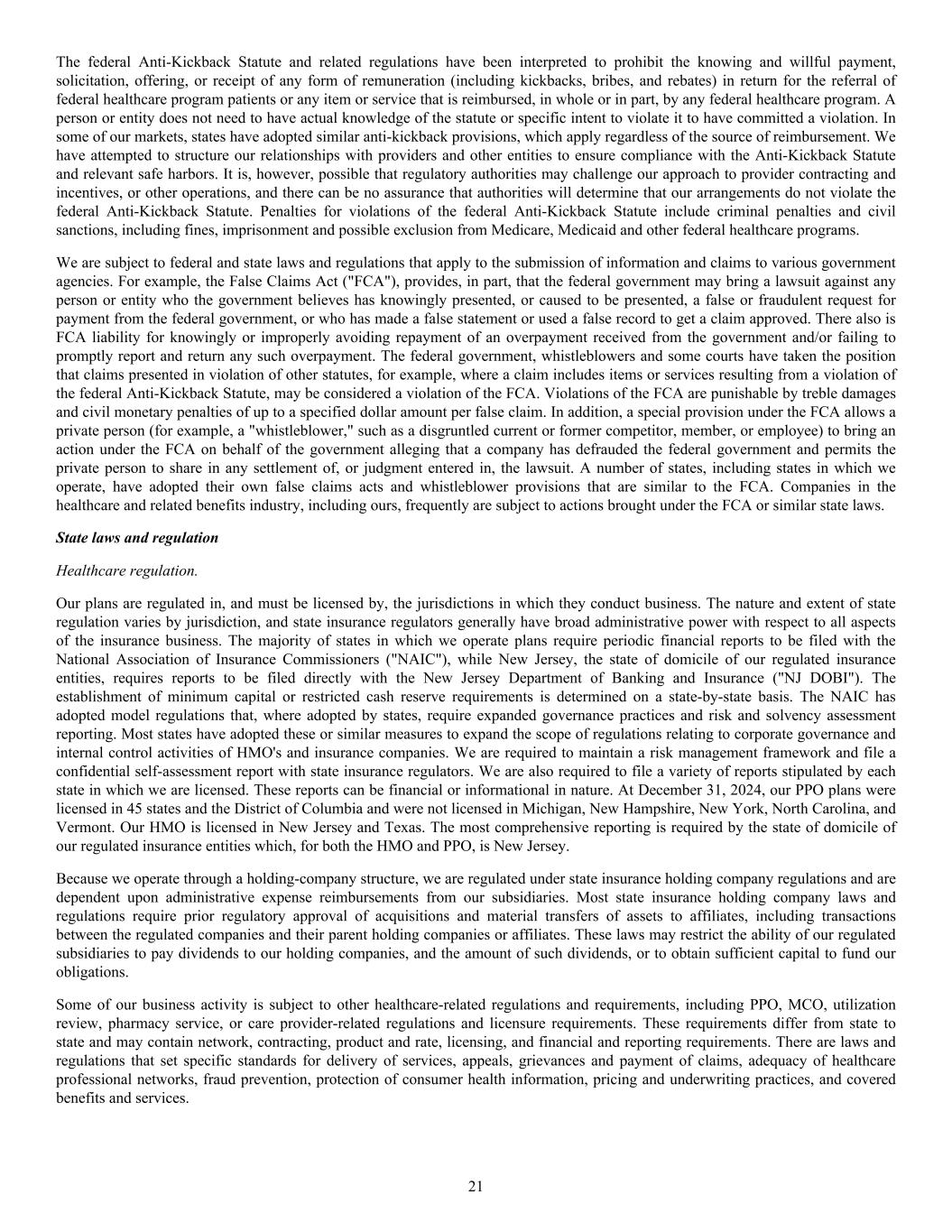 联邦反回扣法规和相关法规被解释为禁止明知而故意支付、索取、提供或接受任何形式的报酬(包括回扣、贿赂和回扣),以换取联邦医疗保健计划患者的转诊或任何联邦医疗保健计划全部或部分报销的任何项目或服务。个人或实体无需实际了解法规或违反法规的具体意图即可实施违规。在我们的一些市场中,各州采用了类似的反回扣条款,无论报销来源如何,这些条款都适用。我们试图构建与供应商和其他实体的关系,以确保遵守反回扣法规和相关安全港。然而,监管机构可能会质疑我们对供应商合同和激励措施或其他操作的方法,并且无法保证当局将确定我们的安排不违反联邦反回扣法规。对违反联邦反回扣法规的处罚包括刑事处罚和民事制裁,包括罚款、监禁以及可能被排除在医疗保险、医疗补助和其他联邦医疗保健计划之外。我们受联邦和州法律法规的约束,这些法律法规适用于向各种政府机构提交信息和索赔。例如,《虚假索赔法》(“FCA”)部分规定,联邦政府可以对政府认为故意提出或导致提出虚假或欺诈性的联邦政府付款请求,或做出虚假陈述或使用虚假记录以使索赔获得批准的任何个人或实体提起诉讼。对于故意或不当避免偿还从政府收到的多付款项和/或未能及时报告和退回任何此类多付款项,FCA也负有责任。联邦政府、举报人和一些法院的立场是,违反其他法规提出的索赔,例如,如果索赔包括因违反联邦反回扣法规而产生的物品或服务,则可能被视为违反了FCA。违反FCA的行为将被处以每项虚假索赔三倍赔偿金和最高指定金额的民事罚款。此外,FCA下的一项特殊条款允许私人(例如“举报人”,例如心怀不满的现任或前任竞争对手、成员或雇员)代表政府根据FCA提起诉讼,指控一家公司欺骗了联邦政府,并允许该私人分享诉讼的任何和解或作出的判决。许多州,包括我们开展业务的州,都采用了自己的虚假索赔法案和类似于《FCA》的举报人条款。包括我们在内的医疗保健和相关福利行业的公司经常会受到根据FCA或类似州法律提起的诉讼。州法律法规医疗保健法规。我们的计划在它们开展业务的司法管辖区受到监管,并且必须获得许可。国家监管的性质和程度因司法管辖区而异,国家保险监管机构通常对保险业务的各个方面拥有广泛的行政权力。我们运营计划的大多数州都要求向全国保险专员协会(“NAIC”)提交定期财务报告,而我们受监管保险实体的住所地新泽西州则要求直接向新泽西州银行和保险部(“NJ DOBI”)提交报告。最低资本或限制性现金储备要求的制定是在各州的基础上确定的。NAIC采用了示范法规,在各州采用的情况下,要求扩大治理实践以及风险和偿付能力评估报告。大多数州已采取这些或类似措施,以扩大与货管公司和保险公司的公司治理和内部控制活动相关的法规范围。我们被要求维护风险管理框架,并向州保险监管机构提交保密的自我评估报告。我们还被要求提交我们获得许可的每个州规定的各种报告。这些报告可以是财务报告,也可以是信息报告。2024年12月31日,我们的OPPO计划在45个州和哥伦比亚特区获得许可,未在密歇根州、新罕布什尔州、纽约州、北卡罗来纳州和佛蒙特州获得许可。我们的HMO在新泽西州和德克萨斯州获得许可。最全面的报告是由我们受监管的保险实体的住所状态要求的,对于货管组织和OPPO来说, 是新泽西州。因为我们通过控股公司结构运营,我们受到国家保险控股公司法规的监管,并且依赖于我们子公司的行政费用报销。大多数州保险控股公司的法律和法规要求对收购和向关联公司进行资产的重大转移进行事先监管批准,包括受监管公司与其母控股公司或关联公司之间的交易。这些法律可能会限制我们受监管的子公司向我们的控股公司支付股息的能力,以及此类股息的金额,或获得足够的资本来为我们的义务提供资金的能力。我们的部分业务活动受制于其他与医疗保健相关的法规和要求,包括OPPO、MCO、使用审查、药房服务或与护理提供者相关的法规和许可要求。这些要求因州而异,可能包含网络、合同、产品和费率、许可以及财务和报告要求。有法律法规对提供服务、申诉、申诉和支付索赔、医疗保健专业网络的适当性、欺诈预防、消费者健康信息保护、定价和承保做法、覆盖的福利和服务等设定了具体标准。21