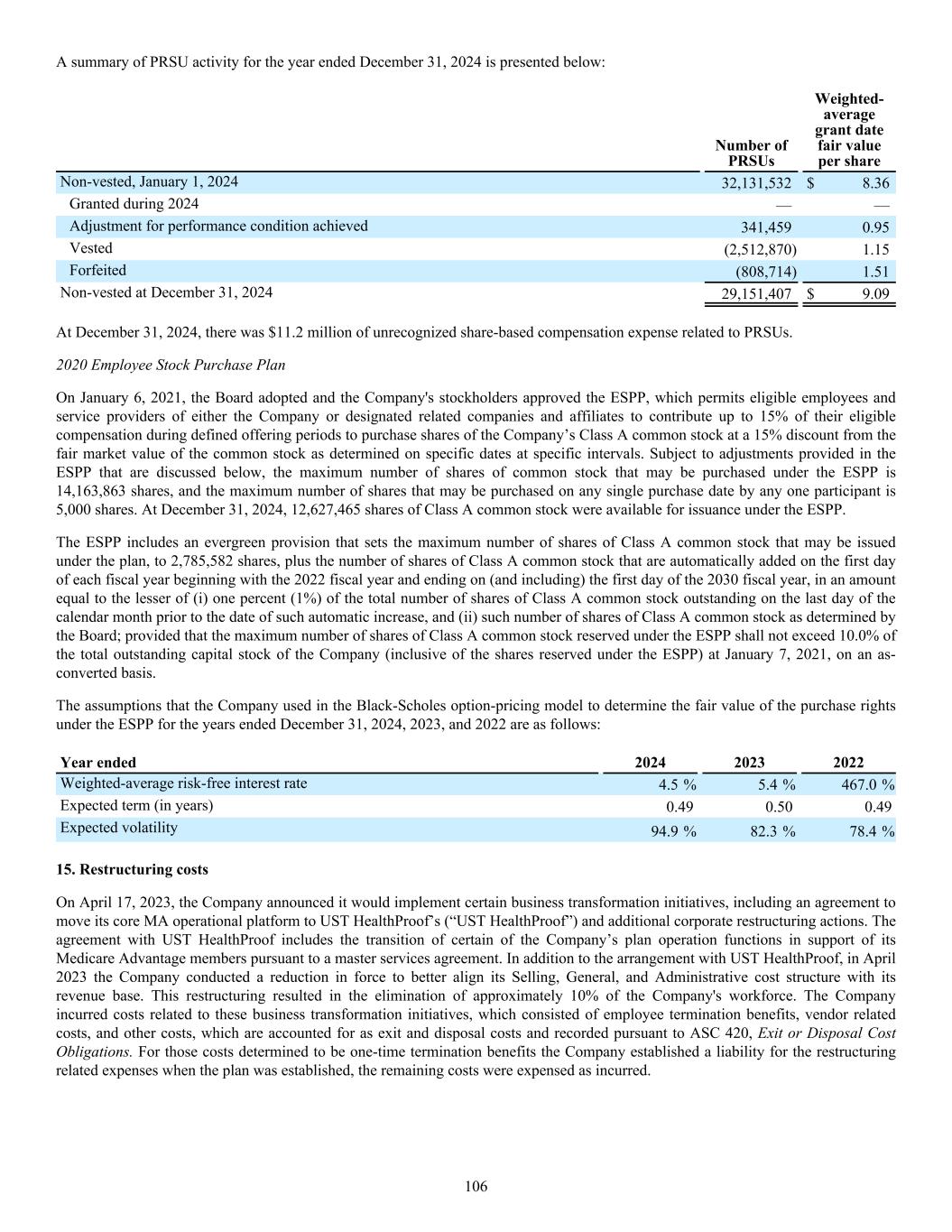 截至2024年12月31日止年度的PRSU活动摘要如下:PRSU加权数量-平均授予日每股公允价值未归属,2024年1月1日32,131,532美元8.36美元在2024年期间授予——业绩条件调整实现341,4590.95已归属(2,512,870)1.15没收(808,714)1.51截至2024年12月31日未归属29,151,407美元9.09截至2024年12月31日,与PRSU相关的未确认股份补偿费用为1,120万美元。2020年员工股票购买计划于2021年1月6日,董事会通过且公司股东批准了ESPP,该计划允许公司或指定的相关公司和关联公司的合格员工和服务提供商在规定的发售期内贡献最多15%的合格薪酬,以在特定时间间隔以特定日期确定的普通股公平市场价值的15%折扣购买公司A类普通股的股份。根据下文讨论的ESPP规定的调整,根据ESPP可购买的普通股的最大数量为14,163,863股,任何一个参与者在任何单一购买日期可购买的最大数量为5,000股。截至2024年12月31日,12,627,465股A类普通股可根据ESPP发行。ESPP包括一项常青条款,将根据该计划可能发行的A类普通股的最大股份数量设定为2,785,582股,加上自2022财年开始至2030财年第一天(包括)结束的每个财年第一天自动增加的A类普通股的股份数量,金额相当于(i)该自动增加日期前一个日历月最后一日已发行的A类普通股股份总数的百分之一(1%)和(ii)董事会确定的A类普通股股份数量中的较低者;但根据ESPP保留的A类普通股股份的最高数量不得超过2021年1月7日公司已发行股本总额(包括根据ESPP保留的股份)的10.0%,在转换后的基础上。公司在Black-Scholes期权定价模型中用于确定ESPP下购买权截至2024年12月31日、2023年、2022年12月31日止年度公允价值的假设如下:截至2024年20232022年加权平均无风险利率4.5% 5.4% 467.0%预期期限(年)0.49 0.50 0.49预期波动率94.9% 82.3% 78.4% 15。重组成本2023年4月17日,公司宣布将实施某些业务转型举措,包括同意将其核心MA运营平台迁移至UST HealthProof(“UST HealthProof”)以及额外的公司重组行动。与UST HealthProof的协议包括根据主服务协议过渡公司的某些计划运营职能,以支持其Medicare Advantage成员。除了与UST HealthProof的安排外,2023年4月,该公司进行了一次减持,以更好地使其销售、一般和行政成本结构与其收入基础保持一致。此次重组导致公司约10%的员工被淘汰。公司发生了与这些业务转型举措相关的成本,其中包括员工解雇福利、供应商相关成本以及其他成本,这些成本作为退出和处置成本入账,并根据ASC 420、退出或处置成本义务入账。对于那些被确定为一次性解雇福利的费用,公司在计划成立时就重组相关费用确立了负债,其余费用在发生时计入费用。106