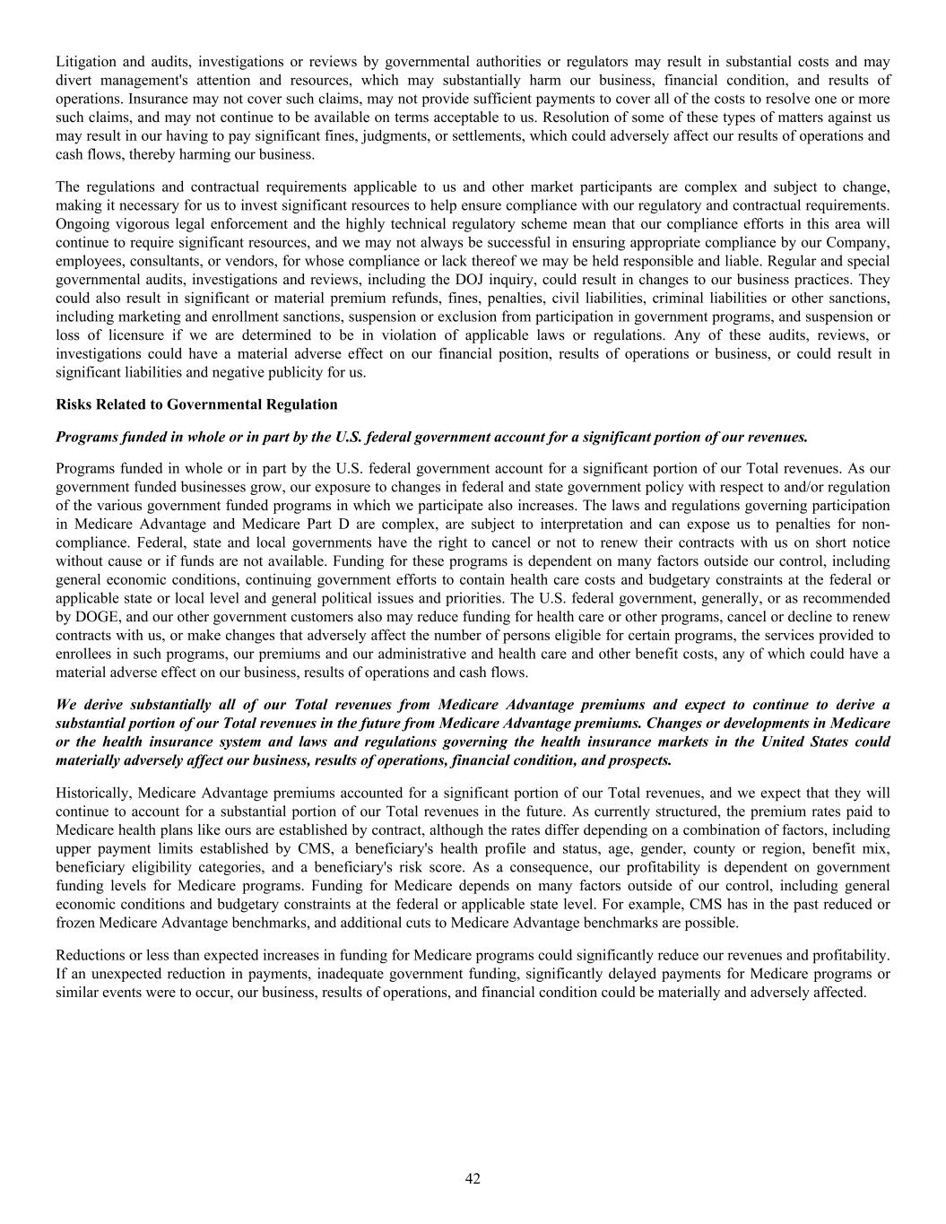 政府当局或监管机构的诉讼和审计、调查或审查可能会导致大量成本,并可能转移管理层的注意力和资源,这可能会对我们的业务、财务状况和经营业绩造成重大损害。保险可能不涵盖此类索赔,可能无法提供足够的付款来支付解决一项或多项此类索赔的所有费用,并且可能无法继续以我们可接受的条款提供。解决其中一些针对我们的这类事项可能会导致我们不得不支付巨额罚款、判决或和解,这可能会对我们的经营业绩和现金流产生不利影响,从而损害我们的业务。适用于我们和其他市场参与者的法规和合同要求是复杂的,并且可能会发生变化,因此我们有必要投入大量资源来帮助确保遵守我们的监管和合同要求。持续有力的法律执行和高度技术性的监管计划意味着,我们在这一领域的合规工作将继续需要大量资源,我们可能并不总是能够成功地确保我们的公司、员工、顾问或供应商适当合规,我们可能会为其合规或缺乏合规承担责任和责任。定期和特别的政府审计、调查和审查,包括司法部的调查,可能会导致我们的商业行为发生变化。它们还可能导致重大或重大的保费退款、罚款、处罚、民事责任、刑事责任或其他制裁,包括营销和入学制裁、暂停或排除参与政府项目,以及如果我们被确定违反适用的法律或法规,则暂停或失去执照。任何这些审计、审查或调查都可能对我们的财务状况、经营业绩或业务产生重大不利影响,或可能导致我们承担重大责任和负面宣传。与全部或部分由美国联邦政府资助的政府监管计划相关的风险占我们收入的很大一部分。由美国联邦政府全部或部分资助的项目占我们总收入的很大一部分。随着我们政府资助的企业的增长,我们对联邦和州政府政策变化的风险敞口也增加了,这些政策与我们参与的各种政府资助项目有关和/或监管。监管参与Medicare Advantage和Medicare Part D的法律法规很复杂,需要进行解释,并可能使我们因不遵守规定而受到处罚。联邦、州和地方政府有权在短时间内无故取消或不与我们续签合同,或者如果资金无法使用。这些项目的资金依赖于我们无法控制的许多因素,包括总体经济状况、政府持续努力控制医疗保健成本以及联邦或适用的州或地方一级的预算限制以及一般政治问题和优先事项。美国联邦政府,一般来说,或根据DOGE的建议,以及我们的其他政府客户也可能减少对医疗保健或其他项目的资助,取消或拒绝与我们续签合同,或做出对符合某些项目资格的人数、向此类项目的参与者提供的服务、我们的保费以及我们的行政和医疗保健以及其他福利成本产生不利影响的变更,其中任何一项都可能对我们的业务、经营业绩和现金流产生重大不利影响。我们几乎所有的总收入都来自Medicare Advantage保费,并预计未来我们总收入的很大一部分将继续来自Medicare Advantage保费。医疗保险或健康保险制度的变化或发展以及管理美国健康保险市场的法律法规可能会对我们的业务、经营业绩、财务状况和前景产生重大不利影响。从历史上看,Medicare Advantage保费占我们总收入的很大一部分,我们预计未来它们将继续占我们总收入的很大一部分。按照目前的结构,支付给像我们这样的医疗保险健康计划的保险费率是通过合同确定的,尽管费率取决于多种因素的组合,包括CMS制定的支付上限、受益人的健康状况和状况、年龄、性别、县或地区、福利组合、受益人资格类别以及受益人的风险评分。因此,我们的盈利能力取决于政府对医疗保险计划的资助水平。为医疗保险提供资金取决于我们无法控制的许多因素, 包括联邦或适用的州一级的一般经济状况和预算限制。例如,CMS在过去降低或冻结了Medicare Advantage基准,对Medicare Advantage基准的额外削减是可能的。医疗保险计划资金的减少或增加低于预期可能会显着降低我们的收入和盈利能力。如果发生意外的付款减少、政府资金不足、医疗保险计划的付款明显延迟或类似事件,我们的业务、经营业绩和财务状况可能会受到重大不利影响。42