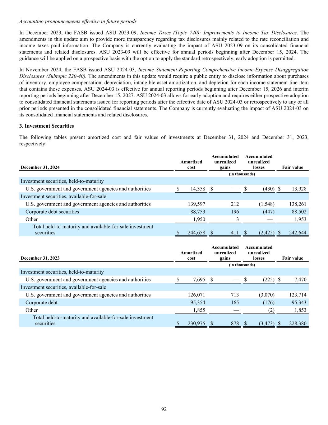 2023年12月在未来期间生效的会计公告,FASB发布了ASU 2023-09,所得税(主题740):所得税披露的改进。本次更新中的修订旨在提供更多透明度,主要涉及税率对账和所得税已付信息的税务披露。该公司目前正在评估ASU2023-09对其合并财务报表和相关披露的影响。ASU2023-09将于2024年12月15日之后开始的年度期间生效。该指南将在前瞻性基础上适用,并可选择追溯适用该标准,允许提前采用。2024年11月,FASB发布了ASU 2024-03,损益表-报告综合收入-费用分类披露(子主题220-40)。此次更新中的修订将要求公共实体披露包含这些费用的每个损益表细目的库存采购、员工薪酬、折旧、无形资产摊销和损耗信息。ASU2024-03在2026年12月15日之后开始的年度报告期间和2027年12月15日之后开始的中期报告期间生效。ASU2024-03允许提前采用,并要求前瞻性地采用ASU2024-03生效日期之后的报告期发布的合并财务报表,或追溯到合并财务报表中列报的任何或所有以前期间。该公司目前正在评估ASU2024-03对其合并财务报表和相关披露的影响。3.投资证券下表分别列示2024年12月31日和2023年12月31日投资的摊余成本和公允价值:2024年12月31日摊余成本累计未实现收益累计未实现亏损公允价值(单位:千)投资证券、持有至到期美国政府和政府机构和当局$ 14,358 $ — $(430)$ 13,928投资证券、可供出售美国政府和政府机构和当局139,597212(1,548)138,261公司债务证券88,753196(447)88,502其他1,9503 — 1,953持有至到期和可供出售投资证券总额$ 244,658 $ 411 $(2,425)$ 242,644 12月31日,2023摊余成本累计未实现收益累计未实现亏损公允价值(千)投资证券、持有至到期美国政府和政府机构和当局$ 7,695 $ — $(225)$ 7,470投资证券、可供出售美国政府和政府机构和当局126,071713(3,070)123,714公司债95,354165(176)95,343其他1,855 —(2)1,853持有至到期和可供出售投资证券总额$ 230,975 $ 878 $(3,473)$ 228,38092