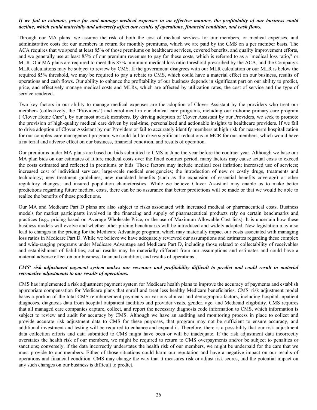 如果我们未能有效地估计、定价和管理医疗费用,我们业务的盈利能力可能会下降,这可能会对我们的经营业绩、财务状况和现金流产生重大不利影响。通过我们的MA计划,我们承担会员的医疗服务成本或医疗费用以及会员的管理成本以换取每月保费的风险,我们由CMS按每个会员支付。ACA要求我们将这些保费的至少85%用于医疗保健服务、承保福利和质量改进工作,并且我们通常将至少85%的保费收入用于支付这些成本,这被称为“医疗损失率”,或MLR。我们的MA计划被要求满足ACA规定的这一85%的最低医疗损失比例阈值,并且公司的MLR计算可能会受到CMS的审查。如果政府不同意我们的MLR计算或我们的MLR低于规定的85%门槛,我们可能需要向CMS支付回扣,这可能会对我们的业务、经营业绩和现金流产生重大影响。我们增强业务盈利能力的能力在很大程度上取决于我们预测、定价和有效管理医疗成本和MLR的能力,这些成本和MLR受到利用率、服务成本和所提供服务类型的影响。我们管理医疗费用能力的两个关键因素是治疗我们会员的提供者(统称为“提供者”)采用Clover Assistant,以及我们风险最高的会员参加我们的临床护理计划,包括我们的家庭初级保健计划(“Clover Home Care”)。通过推动我们的提供者采用Clover Assistant,我们寻求推动向医疗保健提供者提供由实时、个性化和可操作的洞察力驱动的高质量医疗服务。如果我们未能推动我们的提供者采用Clover Assistant或未能为我们复杂的护理管理计划准确识别近期住院风险高的成员,我们可能无法推动我们成员的MCR显着降低,这将对我们的业务、财务状况和经营业绩产生重大不利影响。我们在MA计划下的保费是基于合同年前一年6月份提交给CMS的投标。尽管我们的MA计划投标基于我们对固定合同期内未来医疗成本的估计,但许多因素可能导致实际成本超过估计并反映在保费或投标中的成本。这些因素可能包括医疗成本膨胀;服务使用增加;个人服务成本增加;大规模医疗紧急情况;引入新的或昂贵的药物、治疗和技术;新的治疗指南;新的强制性福利(例如扩大基本福利覆盖范围)或其他监管变化;以及投保人群特征。虽然我们认为Clover Assistant可能使我们能够对未来的医疗成本做出更好的预测,但无法保证会做出更好的预测,或者我们能够实现这些预测的好处。我们的MA和Medicare D部分计划也受到与医疗或药品成本增加相关的风险的影响。参与医药产品融资和供应的市场参与者的商业模式依赖于某些基准和做法(例如,根据平均批发价格定价,或使用最大允许成本清单)。目前尚不确定这些商业模式将如何演变,以及是否会引入和广泛采用其他定价基准。新的立法还可能导致Medicare Advantage计划的定价发生变化,这可能会对我们在Medicare D部分中管理损失率的相关成本产生重大影响。虽然我们认为我们已经充分审查了我们对Medicare Advantage和Medicare D部分下这些复杂而广泛的计划的假设和估计,包括那些与应收账款的可收回性和负债的建立相关的假设和估计,但实际结果可能与我们的假设和估计存在重大差异,并可能对我们的业务、财务状况和经营业绩产生重大不利影响。康哲药业的风险调整支付系统使我们的收入和盈利能力难以预测,并可能导致对我们的经营业绩进行重大的追溯调整。CMS为医疗保险健康计划实施了风险调整支付系统,以提高支付的准确性,并为登记和治疗不太健康的医疗保险受益人的医疗保险计划建立适当的补偿。康哲药业的风险调整模型基于各种临床和人口因素,包括医院住院诊断、 来自医院门诊设施和提供者就诊、性别、年龄和医疗补助资格的诊断数据。CMS要求所有管理式医疗企业获取、收集并向CMS报告必要的诊断码信息,哪些信息接受CMS的审核和审计,以确保其准确性。尽管我们有一个审计和监测流程来收集并为这些目的向CMS提供准确的风险调整数据,但该程序可能不足以确保准确性,将需要额外的投资和测试来增强和扩展它。因此,有可能我们的风险调整数据收集工作和提交给CMS的数据可能已经或将是不充分的。如果风险调整数据错误地夸大了我们会员的健康风险,我们可能会被要求退回CMS多付的款项和/或受到处罚或制裁;相反,如果数据错误地低估了我们会员的健康风险,我们可能会因为必须为会员提供的护理而被少付。这两种情况中的任何一种都可能损害我们的声誉,并对我们的经营业绩和财务状况产生负面影响。CMS可能会改变其衡量风险的方式或调整风险评分,而对我们业务的任何此类变化的潜在影响很难预测。26