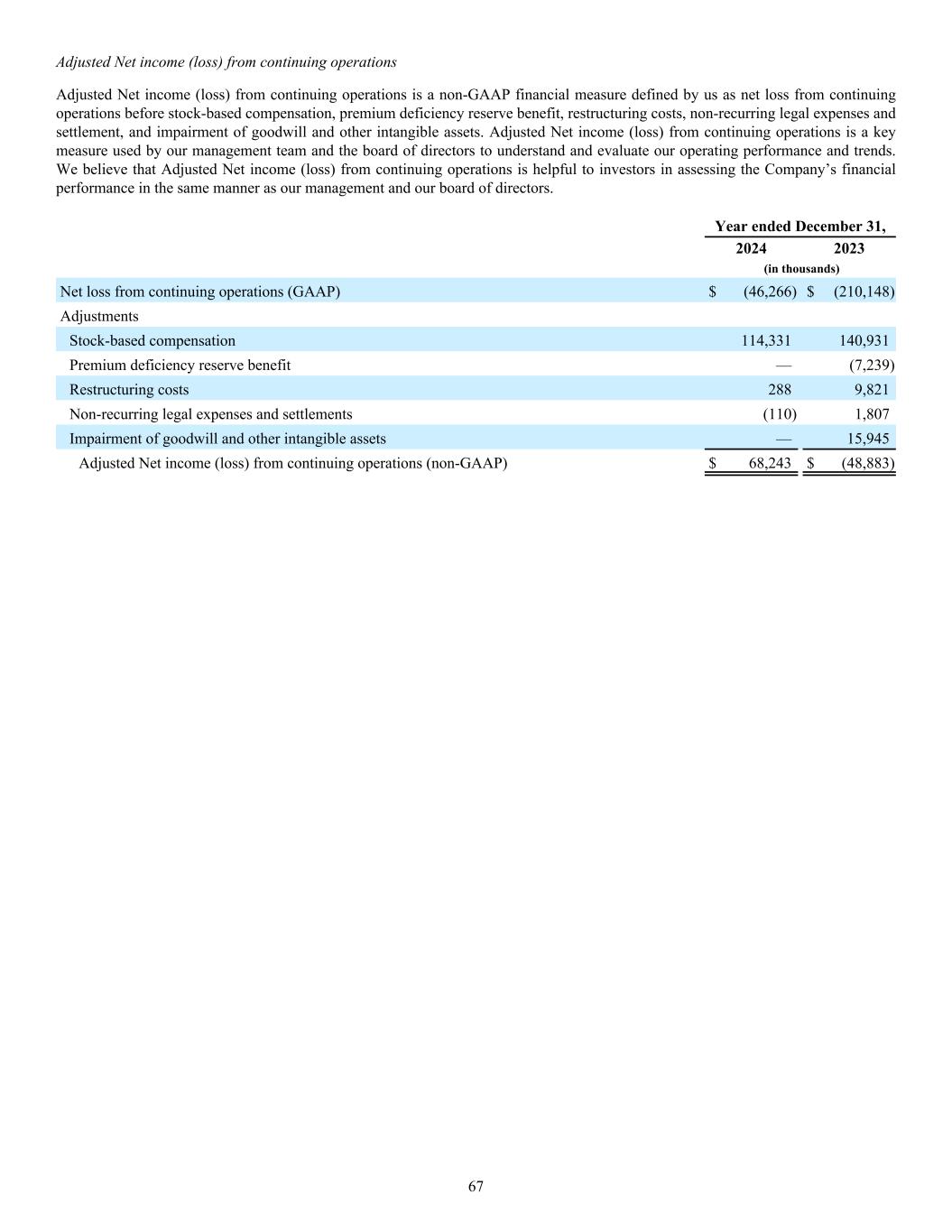 调整后的持续经营净收入(亏损)调整后的持续经营净收入(亏损)是一种非公认会计准则财务指标,我们将其定义为在基于股票的补偿、溢价不足准备金利益、重组成本、非经常性法律费用和和解以及商誉和其他无形资产减值之前的持续经营净亏损。调整后的持续经营净收入(亏损)是我们的管理团队和董事会用来了解和评估我们的经营业绩和趋势的关键衡量标准。我们认为,来自持续经营业务的调整后净收入(亏损)有助于投资者以与我们的管理层和董事会相同的方式评估公司的财务业绩。截至2024年12月31日止年度2023(单位:千)持续经营净亏损(GAAP)$(46,266)$(210,148)调整股票薪酬114,331140,931溢价不足准备金收益—(7,239)重组成本2889,821非经常性法律费用和和解(110)1,807商誉和其他无形资产减值— 15,945调整后持续经营净收入(亏损)(非GAAP)68,243美元(48,883)67