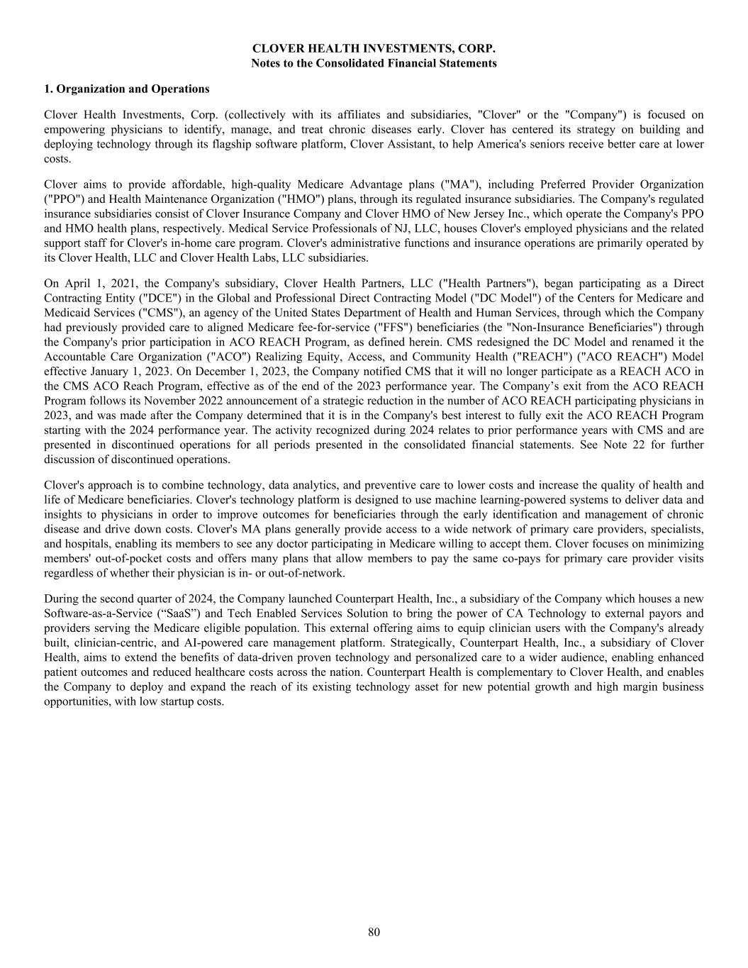 CLOVER Health Investments,CORP。合并财务报表附注1。组织和运营Clover Health Investments, Corp.(与其关联公司和子公司统称为“Clover”或“公司”)专注于赋能医生早期识别、管理和治疗慢性疾病。Clover的战略重点是通过其旗舰软件平台Clover Assistant构建和部署技术,以帮助美国老年人以更低的成本获得更好的护理。Clover旨在通过其受监管的保险子公司提供负担得起的、高质量的Medicare Advantage计划(“MA”),包括Preferred Provider Organization(“OPPO”)和Health Maintenance Organization(“HMO”)计划。该公司受监管的保险子公司包括Clover Insurance Company和New Jersey Inc.的Clover HMO,它们分别运营公司的OPPO和HMO健康计划。NJ,LLC的医疗服务专业人员为Clover的受雇医生和Clover居家护理计划的相关支持人员提供服务。Clover的行政职能和保险业务主要由其下属的Clover Health,LLC和Clover Health Labs,LLC两家子公司运营。2021年4月1日,公司的子公司Clover Health Partners,LLC(“Health Partners”)开始作为直接签约实体(“DCE”)参与美国卫生与公众服务部的一个机构医疗保险和医疗补助服务中心(“CMS”)的全球和专业直接签约模式(“DC模式”),公司此前通过该模式通过公司先前参与此处定义的ACO REACH计划向一致的医疗保险按服务收费(“FFS”)受益人(“非保险受益人”)提供护理。CMS重新设计了DC模式,并将其更名为实现公平、准入和社区健康(“REACH”)(“ACO REACH”)模式,自2023年1月1日起生效。2023年12月1日,公司通知康哲药业,其将不再作为REACH ACO参与CMS ACO Reach计划,自2023年业绩年度结束时起生效。公司退出ACO REACH计划是在其2022年11月宣布在2023年战略性减少ACO REACH参与医生人数之后做出的,并且是在公司确定从2024年业绩年度开始全面退出ACO REACH计划符合公司的最佳利益之后做出的。2024年期间确认的活动与CMS以前的业绩年度有关,并在合并财务报表中列报的所有期间的已终止经营业务中列报。有关已终止业务的进一步讨论,请参见附注22。Clover的方法是将技术、数据分析和预防性护理相结合,以降低成本并提高医疗保险受益人的健康和生活质量。Clover的技术平台旨在使用机器学习驱动的系统向医生提供数据和见解,以便通过早期识别和管理慢性病来改善受益人的结果并降低成本。Clover的MA计划通常提供与广泛的初级保健提供者、专家和医院网络的联系,使其成员能够看到任何愿意接受他们的参与医疗保险的医生。Clover专注于最大限度地减少会员的自付费用,并提供了许多计划,允许会员为初级保健提供者就诊支付相同的共付额,无论他们的医生是在网络内还是在网络外。在2024年第二季度,公司推出了Counterpart Health,Inc.,这是公司的子公司,其中包含新的软件即服务(“SaaS”)和技术支持服务解决方案,以将加利福尼亚州技术的力量带给服务于符合Medicare资格人群的外部付款人和提供者。此次外部发行旨在为临床医生用户配备公司已构建的、以临床医生为中心、人工智能驱动的护理管理平台。从战略上讲,Clover Health的子公司Counterpart Health,Inc.旨在将数据驱动的成熟技术和个性化护理的好处扩展到更广泛的受众,从而在全国范围内提高患者的治疗效果并降低医疗保健成本。Counterpart Health与Clover Health具有互补性,使公司能够为新的潜在增长和高利润率的业务机会部署和扩大现有技术资产的覆盖范围,启动成本低。80