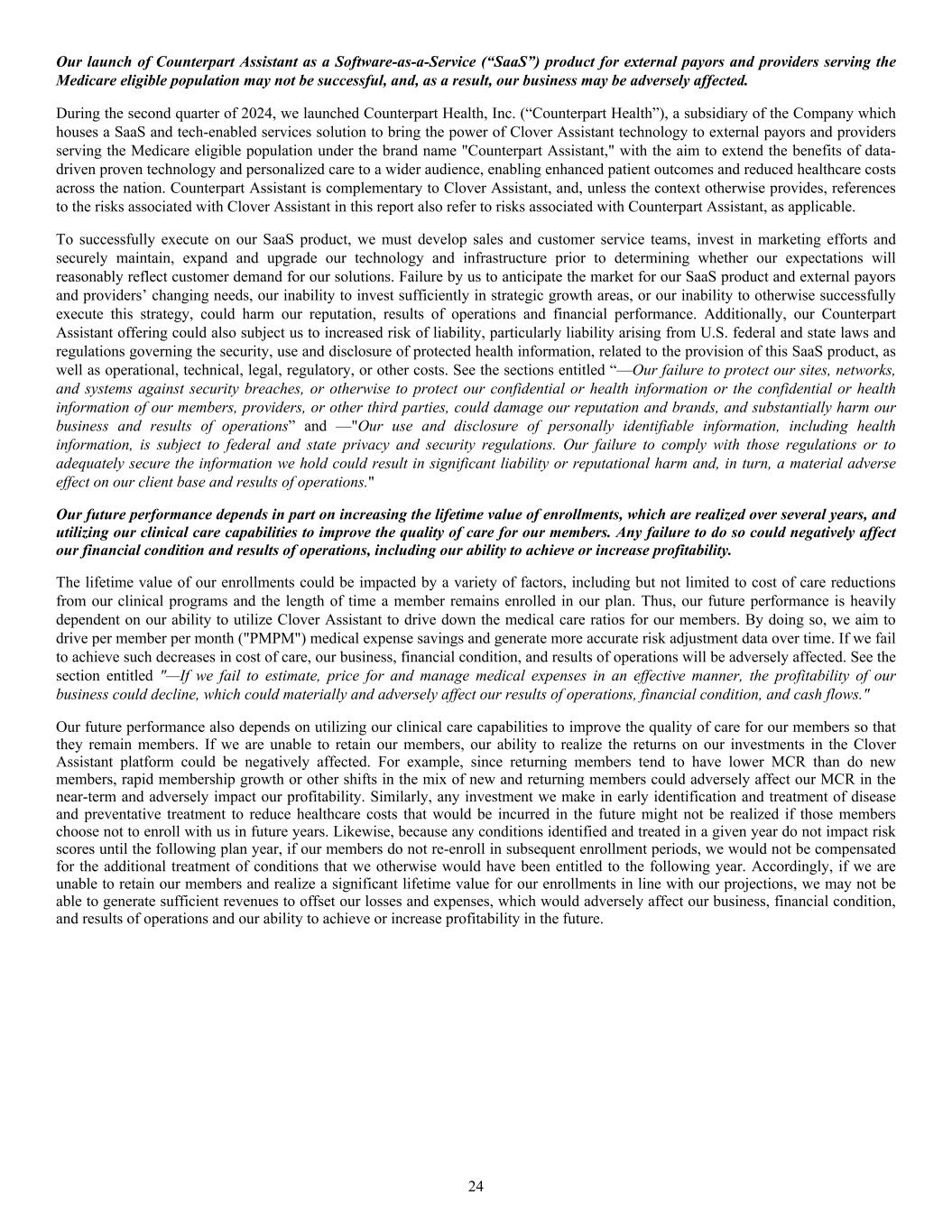 我们推出的Counterpart Assistant作为软件即服务(“SaaS”)产品,面向服务于Medicare合格人群的外部付款人和提供者,可能不会成功,因此,我们的业务可能会受到不利影响。在2024年第二季度,我们推出了Counterpart Health,Inc.(“Counterpart Health”),这是该公司的子公司,其中包含SaaS和技术支持的服务解决方案,以“Counterpart Assistant”的品牌名称将Clover Assistant技术的力量带给服务于Medicare合格人群的外部付款人和提供者,旨在将数据驱动的成熟技术和个性化护理的好处扩展到更广泛的受众,从而在全国范围内提高患者的治疗效果并降低医疗保健成本。Counterpart Assistant是Clover Assistant的补充,除非上下文另有规定,本报告中提及与Clover Assistant相关的风险也是指与Counterpart Assistant相关的风险(如适用)。要在我们的SaaS产品上成功执行,我们必须发展销售和客户服务团队,投资于营销工作,并安全地维护、扩展和升级我们的技术和基础设施,然后才能确定我们的期望是否会合理地反映客户对我们解决方案的需求。我们未能预测我们SaaS产品的市场以及外部付款人和提供商不断变化的需求,我们无法在战略增长领域进行足够的投资,或者我们无法以其他方式成功执行这一战略,可能会损害我们的声誉、运营结果和财务业绩。此外,我们的对口助理产品还可能使我们承担更大的责任风险,特别是与提供此SaaS产品相关的美国联邦和州法律法规对受保护健康信息的安全、使用和披露产生的责任,以及运营、技术、法律、监管或其他成本。请参阅标题为“—我们未能保护我们的站点、网络和系统免受安全漏洞的影响,或未能以其他方式保护我们的机密或健康信息或我们的会员、提供商或其他第三方的机密或健康信息,可能会损害我们的声誉和品牌,并严重损害我们的业务和运营结果”和“我们使用和披露个人身份信息,包括健康信息,受联邦和州隐私和安全法规的约束。我们未能遵守这些规定或未能充分保护我们所持有的信息,可能会导致重大责任或声誉损害,进而对我们的客户群和运营结果产生重大不利影响。”我们未来的业绩部分取决于增加注册的终生价值,这是在几年内实现的,并利用我们的临床护理能力来提高我们会员的护理质量。任何不这样做都可能对我们的财务状况和经营业绩产生负面影响,包括我们实现或提高盈利能力的能力。我们注册的终生价值可能受到多种因素的影响,包括但不限于我们的临床项目减少的护理成本以及会员在我们的计划中保持注册的时间长度。因此,我们未来的表现在很大程度上取决于我们利用Clover Assistant来降低会员的医疗保健比率的能力。通过这样做,我们的目标是推动每个会员每月(“PMPM”)的医疗费用节省,并随着时间的推移产生更准确的风险调整数据。如果我们未能实现这样的护理成本下降,我们的业务、财务状况和经营业绩将受到不利影响。请参阅题为“—如果我们未能有效地估计、定价和管理医疗费用,我们业务的盈利能力可能会下降,这可能会对我们的经营业绩、财务状况和现金流产生重大不利影响。”我们未来的表现还取决于利用我们的临床护理能力来提高我们会员的护理质量,使他们仍然是会员。如果我们无法留住会员,我们在Clover Assistant平台实现投资回报的能力可能会受到负面影响。例如,由于回归会员的MCR往往低于新会员,快速的会员增长或新会员和回归会员组合的其他变化可能会在短期内对我们的MCR产生不利影响,并对我们的盈利能力产生不利影响。同样,如果这些成员选择在未来几年不加入我们,我们可能无法实现我们在疾病的早期识别和治疗以及预防性治疗方面进行的任何投资,以降低未来将产生的医疗保健成本。同样, 由于在给定年份确定和治疗的任何条件直到下一个计划年度才会影响风险评分,如果我们的会员没有在随后的注册期间重新注册,我们将不会获得额外治疗条件的补偿,否则我们将有权在下一年获得这些条件。因此,如果我们无法按照我们的预测留住我们的会员并为我们的注册实现重大的终身价值,我们可能无法产生足够的收入来抵消我们的损失和支出,这将对我们的业务、财务状况和经营业绩以及我们未来实现或提高盈利能力的能力产生不利影响。24