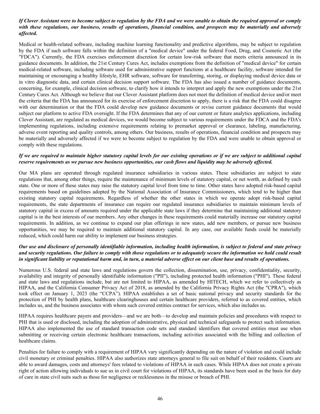 如果Clover Assistant受到FDA的监管,而我们无法获得所需的批准或遵守这些监管,我们的业务、经营业绩、财务状况和前景可能会受到重大不利影响。医疗或健康相关软件,包括机器学习功能和预测算法,如果此类软件属于联邦《食品、药品和化妆品法案》(“FDCA”)下的“医疗设备”定义,可能会受到FDA的监管。目前,FDA对某些符合其指导文件中公布的标准的低风险软件行使执法自由裁量权。此外,《21世纪治愈法案》还包括豁免某些与医疗相关的软件的“医疗器械”定义,包括用于医疗机构行政支持功能的软件、旨在维持或鼓励健康生活方式的软件、EHR软件、用于传输、存储或显示医疗器械数据或体外诊断数据的软件,以及某些临床决策支持软件。FDA还发布了多份指导文件,涉及例如临床决策软件,以明确其打算如何解释和适用《21世纪治愈法案》下的新豁免。尽管我们认为我们的Clover Assistant平台不符合医疗设备的定义和/或不符合FDA宣布的其行使执法自由裁量权申请的标准,但存在FDA可能不同意我们的决定或FDA可能制定新的指导文件或修改当前指导文件的风险,这将使我们的平台受到FDA的积极监督。如果FDA确定我们当前或未来的任何分析应用程序,包括Clover Assistant,作为医疗设备受到监管,我们将受到FDCA和FDA实施法规的各种要求的约束,包括与上市前批准或许可、标签、制造、不良事件报告和质量控制等相关的广泛要求。如果我们受到FDA的监管而无法获得批准或遵守这些法规,我们的业务、经营业绩、财务状况和前景可能会受到重大不利影响。如果我们被要求为现有业务维持较高的法定资本水平,或者如果我们在寻求新业务机会时受到额外资本储备要求的约束,我们的现金流和流动性可能会受到不利影响。我们的MA计划是通过各州受监管的保险子公司运营的。这些子公司须遵守国家规定,除其他外,这些规定要求维持每个州定义的法定资本或净值的最低水平。这些州中的一个或多个州可能会不时提高法定资本水平。其他州则根据全国保险专员协会通过的指导方针,采用了基于风险的资本要求,这些要求往往高于现有的法定资本要求。无论我们经营所在的其他州是否采用基于风险的资本要求,州保险部门可以要求我们受监管的保险子公司保持法定资本的最低水平,如果他们确定保持额外法定资本符合我们成员的最佳利益,则该水平应超过适用的州法律要求的金额。这些要求的任何其他变化都可能大幅增加我们的法定资本要求。此外,随着我们继续在新州扩大我们的计划产品、增加新成员或寻求新的商业机会,我们可能会被要求维持额外的法定资本。无论如何,我们的可用资金可能会大幅减少,这可能会损害我们实施业务战略的能力。我们使用和披露个人身份信息,包括健康信息,受联邦和州隐私和安全法规的约束。我们未能遵守这些规定或未能充分保护我们所持有的信息可能会导致重大责任或声誉损害,进而对我们的客户群和运营结果产生重大不利影响。许多美国联邦和州法律法规对个人身份信息(“PII”)的收集、传播、使用、隐私、机密性、安全性、可用性和完整性进行管理,其中包括受保护的健康信息(“PHI”)。这些联邦和州法律法规包括但不限于经HITECH修订的HIPAA,我们统称为HIPAA,以及经1月1日生效的《加利福尼亚州隐私权法案》(“CPRA”)修订的《2018年加利福尼亚州消费者隐私法案》, 2023(“CCPA”)。HIPAA建立了一套基本的国家隐私和安全标准,用于由健康计划、医疗保健信息交换所和某些医疗保健提供者保护PHI,称为涵盖实体,其中包括我们,以及与这些涵盖实体签订服务合同的商业伙伴,其中也包括我们。HIPAA要求医疗保健支付者和提供者——我们都是——制定和维护有关使用或披露的PHI的政策和程序,包括采取行政、实物和技术保障措施来保护此类信息。HIPAA还实施了涵盖实体在提交或接收某些电子医疗保健交易时必须使用的标准交易代码集和标准标识符的使用,包括与医疗保健索赔的计费和收集相关的活动。未遵守HIPAA要求的处罚因违规性质而有很大差异,可能包括民事罚款或刑事处罚。HIPAA还授权州检察长代表其居民提起诉讼。在此类案件中,法院能够判给与违反HIPAA相关的损害赔偿、费用和律师费。虽然HIPAA并未创建允许个人因违反HIPAA而在民事法庭起诉我们的私人诉讼权,但其标准已被用作州民事诉讼中注意义务的基础,例如滥用或违反PHI的疏忽或鲁莽行为的诉讼。46