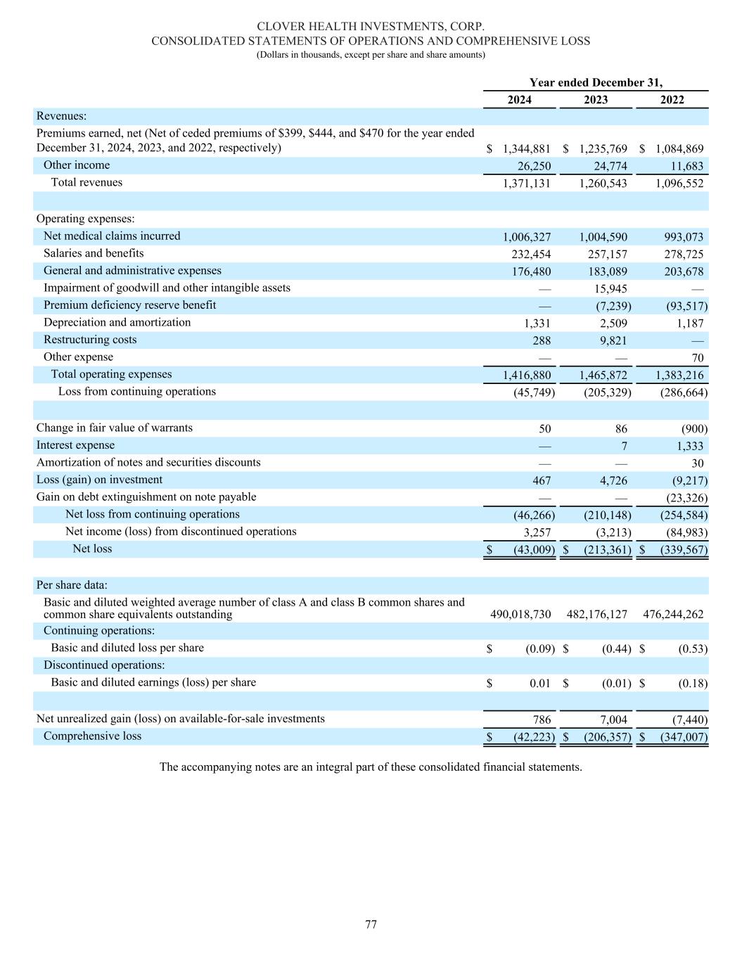 CLOVER Health Investments,CORP。合并经营报表和综合亏损(以千美元计,每股和股份金额除外)截至2024年12月31日止年度2023年2022年收入:已赚保费净额(扣除截至2024年12月31日、2023年和2022年12月31日止年度的分出保费399美元、444美元和470美元,分别)1,344,881美元1,235,769美元1,084,869美元其他收入26,25024,77411,683总收入1,371,1311,260,5431,096,552营业费用:发生的医疗索赔净额1,006,3271,004,590993,073工资和福利232,454257,157278,725一般和行政费用176,480183,089203,678商誉和其他无形资产减值— 15,945 —溢价不足准备金收益—(7,239)(93,517)折旧及摊销1,3312,5091,187重组成本2889,821 —其他费用—— 70营业费用总额1,416,8801,465,8721,383,216持续经营亏损(45,749)(205,329)(286,664)认股权证公允价值变动5086(900)利息费用— 71,333票据和证券折价摊销—— 30投资损失(收益)4674,726(9,217)应付票据债务清偿收益——(23,326)持续经营净亏损(46,266)(210,148)(254,584)终止经营净收益(亏损)3,257(3,213)(84,983)净亏损$(43,009)$(213,361)$(339,567)每股数据:基本A类和B类普通股及已发行普通股等价物的稀释加权平均数490,018,730482,176,127476,244,262持续经营:每股基本和稀释亏损$(0.09)$(0.44)$(0.53)终止经营:每股基本和摊薄收益(亏损)$ 0.01 $(0.01)$(0.18)可供出售投资的未实现净收益(亏损)7867,004(7,440)综合亏损$(42,223)$(206,357)$(347,007)随附的附注是这些综合财务报表的组成部分。77