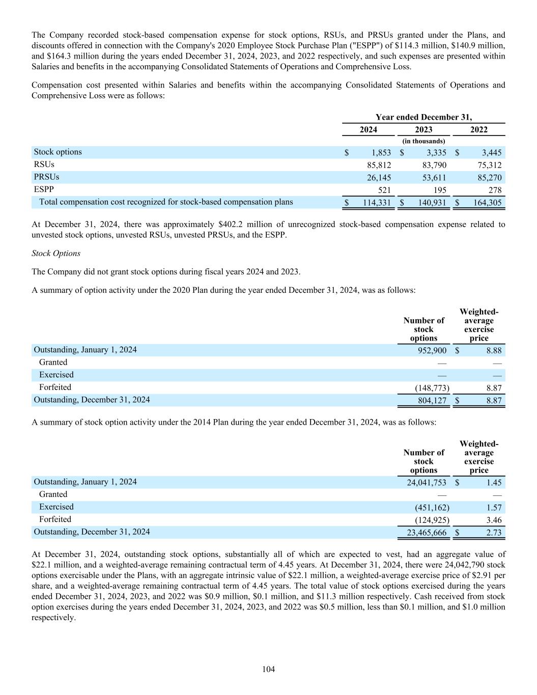 公司在截至2024年12月31日、2023年和2022年12月31日止年度分别记录了根据计划授予的股票期权、RSU和PRSU的基于股票的补偿费用,以及与公司2020年员工股票购买计划(“ESPP”)相关的折扣1.143亿美元、1.409亿美元和1.643亿美元,这些费用在随附的综合经营和综合亏损报表的工资和福利中列报。随附的综合经营和综合亏损报表中的薪酬和福利中列报的薪酬成本如下:截至2024年12月31日止年度20232022(单位:千)股票期权$ 1,853 $ 3,335 $ 3,445 RSU 85,81283,79075,312 PRSUS 26,14553,61185,270 ESPP 521195278基于股票的薪酬计划确认的总薪酬成本$ 114,331 $ 140,931 $ 164,305截至2024年12月31日,与未归属的股票期权、未归属的RSU、未归属的PRSUS和ESPP相关的未确认的基于股票的薪酬费用约为4.022亿美元。股票期权公司在2024和2023财年没有授予股票期权。截至2024年12月31日止年度2020年计划下的期权活动摘要如下:股票期权加权-平均行使价未行使,2024年1月1日952,900美元8.88已授予——已行使——没收(148,773)8.87未行使,2024年12月31日804,127美元截至2024年12月31日止年度2014年计划下的股票期权活动摘要如下:股票期权加权-平均行使价未行使,2024年1月1日24,041,753美元1.45已授予——已行使(451,162)1.57没收(124,925)3.46未行使,12月31日,2024年23,465,666美元2.73截至2024年12月31日,未行使的股票期权,预计几乎全部归属,总价值为2210万美元,加权平均剩余合同期限为4.45年。截至2024年12月31日,根据这些计划可行使的股票期权为24,042,790份,总内在价值为2210万美元,加权平均行权价为每股2.91美元,加权平均剩余合同期限为4.45年。截至2024年12月31日、2023年12月31日、2022年12月31日止年度行使的股票期权总价值分别为90万美元、10万美元、1130万美元。截至2024年12月31日、2023年12月31日和2022年12月31日止年度,行使股票期权收到的现金分别为50万美元、不到10万美元和100万美元。104