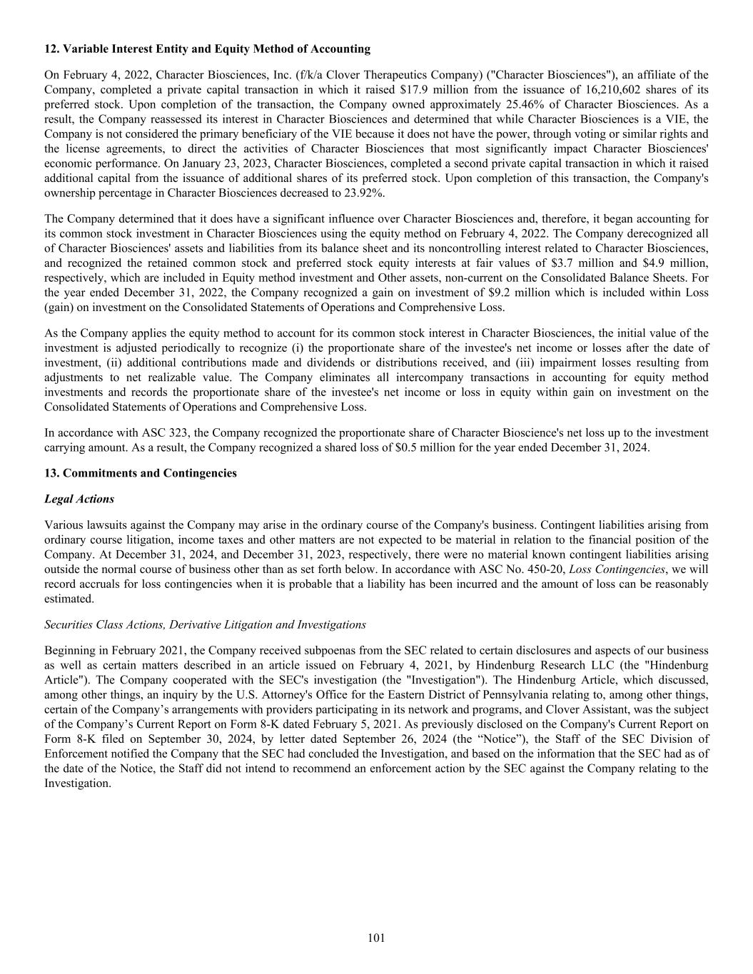 12.可变利益实体和权益法核算2022年2月4日,公司关联公司Character Biosciences,Inc.(f/k/a Clover Therapeutics Company)(“Character Biosciences”)完成了一项私人资本交易,其中通过发行16,210,602股优先股筹集了1790万美元。交易完成后,公司拥有Character Biosciences约25.46%的股权。因此,公司重新评估了其对Character Biosciences的兴趣,并确定虽然Character Biosciences是VIE,但公司不被视为VIE的主要受益人,因为公司没有权力通过投票或类似权利和许可协议来指导Character Biosciences对Character Biosciences的经济业绩影响最大的活动。2023年1月23日,Character Biosciences完成了第二笔私人资本交易,其中通过增发优先股股票筹集额外资金。本次交易完成后,公司对Character Biosciences的所有权比例下降至23.92%。公司认定其对Character Biosciences确实具有重大影响,因此于2022年2月4日开始采用权益法核算其对Character Biosciences的普通股投资。该公司从其资产负债表中终止确认Character Biosciences的所有资产和负债以及与Character Biosciences相关的非控制性权益,并分别以公允价值370万美元和490万美元确认保留的普通股和优先股股权,这些权益在合并资产负债表中计入权益法投资和其他资产,非流动。截至2022年12月31日止年度,公司确认了920万美元的投资收益,该收益包含在综合经营和综合亏损报表的投资损失(收益)中。由于公司采用权益法核算其在Character Biosciences的普通股权益,投资的初始价值会定期调整,以确认(i)在投资日期后按比例分摊的被投资方净收益或亏损,(ii)作出的额外贡献和收到的股息或分配,以及(iii)因调整可变现净值而产生的减值损失。公司在权益法投资会计核算中消除所有公司间交易,并将被投资单位的净收益或权益损失的比例份额记入合并经营和综合损失报表的投资收益内。公司按照ASC 323按比例确认应占Character Bioscience的净亏损直至投资账面值。因此,公司在截至2024年12月31日的年度确认了0.5百万美元的共担亏损。13.承诺和或有事项法律诉讼在公司正常经营过程中可能会出现针对公司的各类诉讼。普通课程诉讼、所得税及其他事项产生的或有负债预期不会对公司的财务状况构成重大影响。分别于2024年12月31日及2023年12月31日,除下文所述外,并无在正常业务过程之外产生的重大已知或有负债。我们将按照ASC第450-20号《或有损失事项》的规定,在很可能已经发生负债且损失金额能够合理估计时,对或有损失事项进行计提。证券集体诉讼、衍生诉讼和调查从2021年2月开始,公司收到SEC的传票,涉及我们业务的某些披露和方面以及Hindenburg Research LLC于2021年2月4日发布的一篇文章中描述的某些事项(“Hindenburg文章”)。公司配合SEC的调查(“调查”)。兴登堡文章讨论了(其中包括)美国宾夕法尼亚州东区检察官办公室关于(其中包括)公司与参与其网络和计划的供应商以及Clover Assistant的某些安排的调查,该文章是公司2021年2月5日表格8-K的当前报告的主题。正如先前在公司于2024年9月30日提交的关于表格8-K的当前报告中通过日期为2024年9月26日的信函(“通知”)披露的那样,SEC执法部门的工作人员通知公司,SEC已完成调查,并且根据SEC截至通知日期所掌握的信息,工作人员不打算建议SEC就调查对公司采取执法行动。101