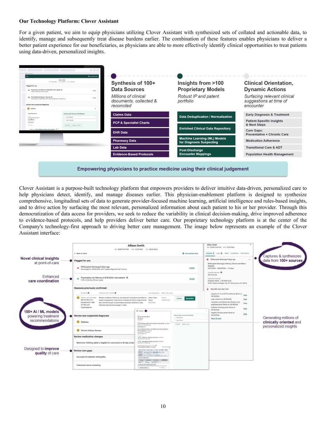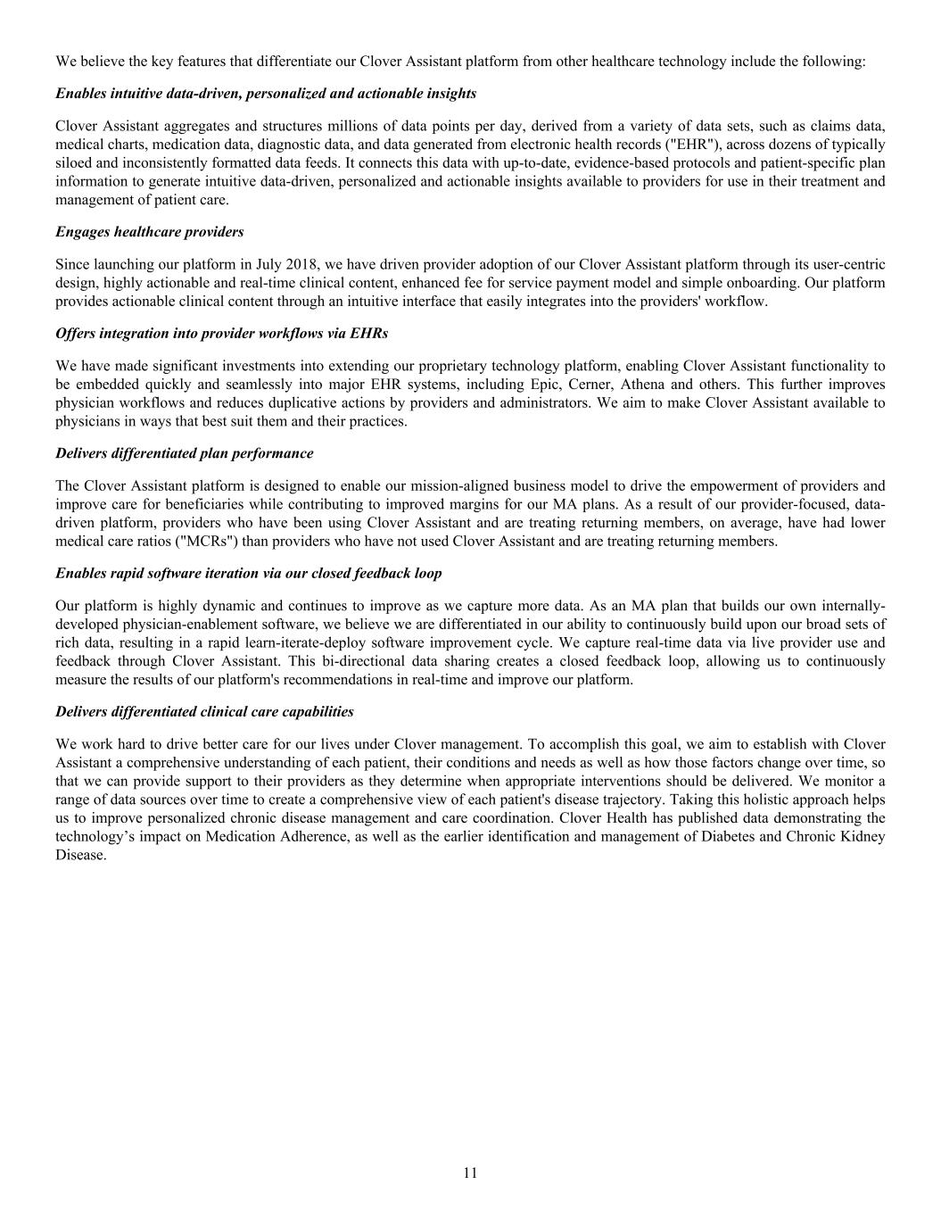 我们认为,我们的Clover Assistant平台有别于其他医疗保健技术的关键功能包括:实现直观的数据驱动、个性化和可操作的洞察力Clover Assistant每天聚合和构建数百万个数据点,这些数据点来自各种数据集,例如索赔数据、医疗图表、用药数据、诊断数据以及电子健康记录(“EHR”)产生的数据,跨越数十个典型的孤立和格式不一致的数据馈送。它将这些数据与最新的、基于证据的协议和针对患者的计划信息连接起来,以生成直观的数据驱动、个性化和可操作的见解,供提供者在其治疗和管理患者护理时使用。自2018年7月推出我们的平台以来,我们通过以用户为中心的设计、高度可操作和实时的临床内容、增强的按服务付费模式和简单的入职,推动了供应商采用我们的Clover Assistant平台。我们的平台通过一个直观的界面提供可操作的临床内容,该界面可轻松集成到提供者的工作流程中。通过EHR提供与供应商工作流程的集成我们已在扩展我们的专有技术平台方面进行了大量投资,使Clover Assistant功能能够快速、无缝地嵌入主要的EHR系统中,包括Epic、Cerner、Athena等。这进一步改善了医生工作流程,并减少了提供者和管理员的重复操作。我们的目标是以最适合医生及其实践的方式向医生提供Clover Assistant。提供差异化的计划绩效Clover Assistant平台旨在使我们的与任务一致的商业模式能够推动为提供者赋权并改善对受益人的护理,同时有助于提高我们MA计划的利润率。由于我们以供应商为中心、数据驱动的平台,平均而言,一直在使用Clover Assistant并正在治疗返回会员的供应商的医疗护理比率(“MCR”)低于未使用Clover Assistant并正在治疗返回会员的供应商。通过我们的闭环反馈循环实现快速软件迭代我们的平台具有高度的动态性,并且随着我们捕获更多数据而不断改进。作为一个构建我们自己内部开发的医生支持软件的MA计划,我们相信我们在持续基于我们广泛的丰富数据集进行构建的能力方面是有区别的,从而产生了一个快速的学习-迭代-部署软件改进周期。我们通过实时提供者使用和通过Clover Assistant的反馈来捕获实时数据。这种双向的数据共享创造了一个闭合的反馈循环,让我们能够不断地实时衡量我们平台的建议结果,并改进我们的平台。提供差异化的临床护理能力我们努力在三叶草管理下为我们的生活带来更好的护理。为了实现这一目标,我们的目标是与Clover Assistant建立对每位患者、他们的状况和需求以及这些因素如何随时间变化的全面了解,以便我们能够在他们的提供者确定何时应该提供适当干预措施时为他们提供支持。我们随着时间的推移监测一系列数据源,以创建每个患者疾病轨迹的全面视图。采取这种整体方法有助于我们改善个性化的慢病管理和护理协调。Clover Health公布了数据,展示了该技术对用药依从性的影响,以及早期对糖尿病和慢性肾病的识别和管理。11