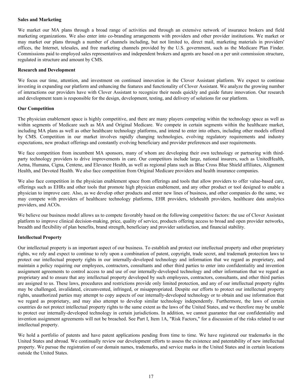 销售和营销我们通过广泛的活动和广泛的保险经纪人和现场营销组织网络来营销我们的MA计划。我们亦与供应商及其他供应商机构订立联合品牌安排。我们通过多种渠道营销或可能营销我们的计划,包括但不限于直接邮寄、供应商办公室的营销材料、互联网、电话销售以及美国政府提供的免费营销渠道,例如Medicare Plan Finder。支付给受雇销售代表和独立经纪人和代理商的佣金基于单位佣金结构,由CMS在结构和金额上进行监管。研发我们将时间、注意力和投入集中在Clover Assistant平台的持续创新上。我们预计将继续投资扩展我们的平台并增强Clover Assistant的特性和功能。我们分析我们的供应商与Clover Assistant进行的越来越多的交互,以快速识别他们的需求并指导未来的创新。我们的研发团队负责为我们的平台设计、开发、测试、交付解决方案。我们的竞争医师赋能空间竞争激烈,在技术空间内以及在MA和Original Medicare等医疗保险细分领域内都有许多参与者在竞争。我们在医疗保健市场的某些细分领域展开竞争,包括MA计划以及其他医疗保健技术平台,并打算进入其他领域,包括CMS提供的其他模式。我们市场的竞争涉及快速变化的技术、不断变化的监管要求和行业期望、新产品的提供以及不断变化的受益者和提供者的偏好和用户要求。我们面临来自现有MA赞助商的竞争,其中许多人正在开发自己的技术或与第三方技术提供商合作,以推动护理方面的改进。我们的竞争对手包括大型全国性保险公司,例如UnitedHealth、Aetna、哈门那、信诺、康西哥和Elevance Health,以及Blue Cross Blue Shield Affiliates、Alignment Health和Devoted Health等区域计划。我们还面临来自原始医疗保险提供者和健康保险公司的竞争。在医生赋能领域,我们还面临着来自允许提供者提供基于价值的护理的产品和工具、诸如EHR和其他促进高医生赋能工具的产品,以及旨在使医生能够改善护理的任何其他产品或工具的竞争。此外,随着我们开发其他产品并进入新的业务线,以及其他公司也这样做,我们可能会与医疗保健技术平台提供商、EHR提供商、远程医疗提供商、医疗保健数据分析提供商和ACO竞争。我们相信,我们的商业模式使我们能够基于以下竞争因素进行有利的竞争:使用Clover Assistant平台改善临床决策、价格、服务质量、产品提供进入广泛和开放的供应商网络、计划利益的广度和灵活性、品牌实力、受益人和供应商满意度以及财务稳定性。知识产权我们的知识产权是我们业务的一个重要方面。为建立和保护我们的知识产权和其他专有权利,我们依赖并期望继续依赖专利、版权、商业秘密和商标保护法律的组合,以保护我们内部开发的技术和信息中我们视为专有的知识产权,并维持一项政策,要求我们的员工、承包商、顾问和其他第三方订立保密和发明转让协议,以控制对我们内部开发的技术和我们认为专有的其他信息的访问和使用,并确保这些员工开发的任何知识产权,承包商、顾问和其他第三方被指派给我们。这些法律、程序和限制只提供有限的保护,我们的任何知识产权都可能受到质疑、无效、规避、侵犯或挪用。尽管我们努力保护我们的知识产权,但未经授权的各方可能会试图复制我们内部开发的技术的某些方面,或获取和使用我们认为专有的信息,也可能试图独立开发类似技术。此外,某些国家的法律对知识产权的保护程度不如美国的法律,因此我们可能无法在某些司法管辖区保护我们内部开发的技术。此外, 我们不能保证我们的保密和发明转让协议不会被违反。有关与我们的知识产权相关的风险的讨论,请参见第一部分,第1A项,“风险因素”。我们持有一系列专利,并不时有专利申请正在申请中。我们已经在美国和国外注册了我们的商标。我们不断审查我们的开发工作,以评估新知识产权的存在和可专利性。我们寻求在美国和美国以外的某些地点注册我们的域名、商标和服务标记。17