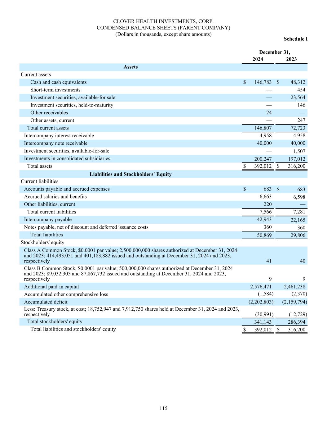 附表一2024年12月31日2023年资产流动资产现金和现金等价物146,783美元48,312美元短期投资— 454投资证券,可供出售— 23,564投资证券,持有至到期— 146其他应收款24 —其他资产,流动— 247流动资产总额146,80772,723公司间应收利息4,9584,958公司间应收票据40,00040,000投资证券,可供出售— 1,507对合并子公司的投资200,247197,012总资产392,012美元316,200美元负债和股东权益流动负债应付账款和应计费用683美元683美元应计工资和福利6,6636,598其他负债,流动220 —流动负债总额7,5667,281公司间应付款项42,94322,165应付票据,扣除贴现和递延发行成本360360负债总额50,86929,806股股东权益A类普通股,面值0.0001美元;2024年12月31日和2023年12月31日授权的2,500,000,000股;2024年12月31日和2023年12月31日已发行和流通的414,493,051股和401,183,882股,分别为4140股B类普通股,面值0.0001美元;2024年12月31日和2023年12月31日授权的500,000,000股;2024年12月31日和2023年12月31日已发行和流通的89,032,305股和87,867,732股,分别99 额外实收资本 2,576,4712,461,238累计其他综合损失(1,584)(2,370)累计亏损(2,202,803)(2,159,794)减:库存股票,按成本;分别于2024年12月31日和2023年12月31日持有18,752,947股和7,912,750股(30,991)(12,729)股东权益总额341,143286,394负债和股东权益总额392,012美元316,200美元CLOVER Health Investments,CORP。简明资产负债表(母公司)(千美元,股份金额除外)115