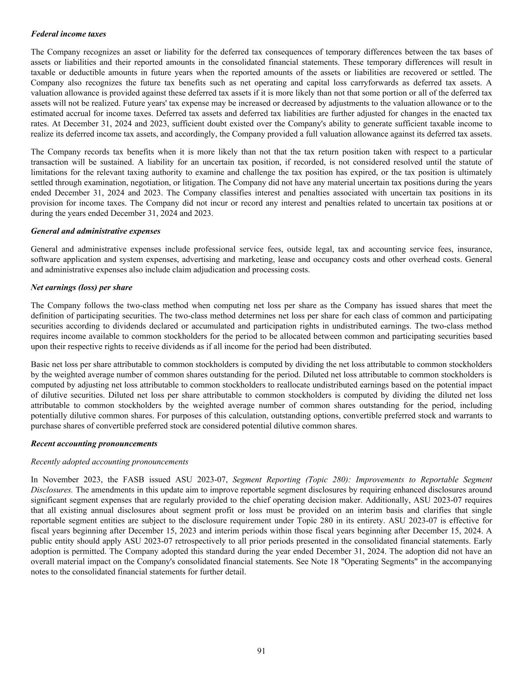 联邦所得税本公司就资产或负债的计税基础与其在综合财务报表中报告的金额之间的暂时性差异产生的递延税项后果确认一项资产或负债。这些暂时性差异将导致在未来年度收回或结算资产或负债的报告金额时产生应课税或可扣除的金额。公司还将净经营和资本亏损结转等未来税收优惠确认为递延所得税资产。如果递延所得税资产的部分或全部很可能无法实现,则对这些递延所得税资产计提估值备抵。未来年度的税项开支可能会因估值备抵或所得税估计应计的调整而增加或减少。递延税项资产和递延税项负债进一步根据已颁布税率的变化进行调整。于2024年12月31日及2023年12月31日,公司产生足够应课税收入以变现其递延所得税资产的能力存在充分的疑问,因此,公司对其递延所得税资产提供了全额估值备抵。当针对特定交易采取的纳税申报立场很可能会持续时,公司会记录税收优惠。不确定税务状况的负债,如果记录在案,则在相关税务机关审查和质疑税务状况的诉讼时效到期,或通过审查、谈判或诉讼最终解决税务状况之前,不被视为已解决。截至2024年12月31日和2023年12月31日止年度,公司没有任何重大的不确定税务状况。该公司将与不确定的税务状况相关的利息和罚款分类在其所得税拨备中。截至2024年12月31日和2023年12月31日止年度或期间,公司没有因不确定的税务状况而产生或记录任何利息和罚款。一般和行政费用一般和行政费用包括专业服务费、外部法律、税务和会计服务费、保险、软件应用和系统费用、广告和营销、租赁和占用成本以及其他间接费用。一般和行政费用还包括索赔裁决和处理费用。每股净收益(亏损)由于公司发行的股票符合参与证券的定义,因此公司在计算每股净亏损时遵循两级法。二分类法根据宣布或累计的股息以及未分配收益中的参与权,确定每类普通和参与证券的每股净亏损。两级法要求普通股股东在该期间可获得的收益根据他们各自获得股息的权利在普通股和参与证券之间分配,就好像该期间的所有收益都已分配一样。归属于普通股股东的基本每股净亏损的计算方法是,将归属于普通股股东的净亏损除以当期已发行普通股的加权平均数。归属于普通股股东的摊薄净亏损是通过调整归属于普通股股东的净亏损以根据稀释性证券的潜在影响重新分配未分配收益来计算的。归属于普通股股东的稀释后每股净亏损的计算方法是,将归属于普通股股东的稀释后净亏损除以该期间已发行普通股的加权平均数,其中包括具有潜在稀释性的普通股。就这一计算而言,尚未行使的期权、可转换优先股和购买可转换优先股股份的认股权证被视为潜在的稀释性普通股。最近的会计公告最近在2023年11月采用了会计公告,FASB发布了ASU 2023-07,分部报告(主题280):可报告分部披露的改进。本次更新中的修订旨在通过要求围绕定期向首席经营决策者提供的重大分部费用加强披露来改进可报告分部披露。此外,ASU 2023-07要求所有现有的关于分部损益的年度披露必须在临时基础上提供,并澄清单一可报告分部实体须遵守主题280下的全部披露要求。ASU2023-07在2023年12月15日之后开始的财政年度和12月15日之后开始的财政年度内的中期有效, 2024.公共实体应将ASU2023-07追溯应用于合并财务报表中列报的所有以前期间。允许提前收养。公司在截至2024年12月31日的年度内采用了这一标准。该采纳并未对公司的综合财务报表产生整体重大影响。详见综合财务报表附注附注18“经营分部”。91